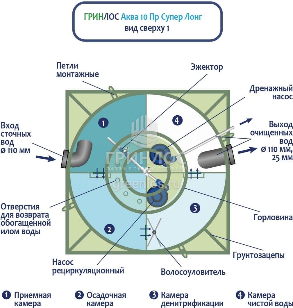 Станции очистки ГРИНЛОС Аква 10 Супер Лонг предназначены для расщепления и переработки основных органических загрязнений, содержащихся в бытовых сточных водах. Попадая в септик и перемещаясь между камерами в корпусе, нечистоты последовательно проходят этапы усреднения, разделения и отстаивания, разделения на фракции (физическая переработка), а также взаимодействуют с бактериями из биозагрузки (биологическая переработка). Далее стоки усредняются и отстаиваются. Осветленная вода выводится наружу самотечным или принудительным образом.