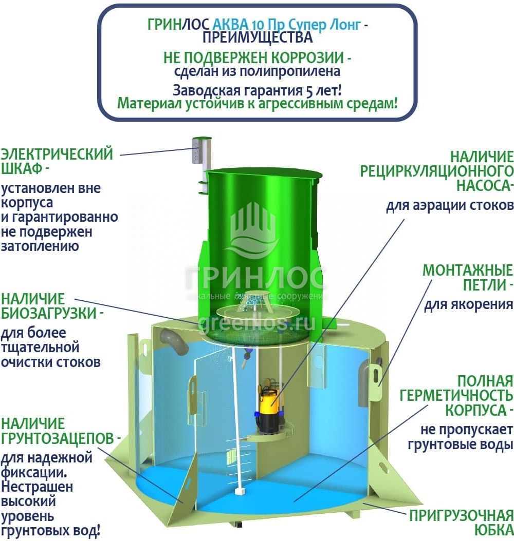 ГРИНЛОС Аква 10 Супер Лонг – это бескомпрессорная станция переработки сточных вод. Конструкция данного септика позволяет принимать не более 860 л залпом, а производительность станции равна 2 м3/сутки. Септик подходит для комфортного проживания 10 человек.