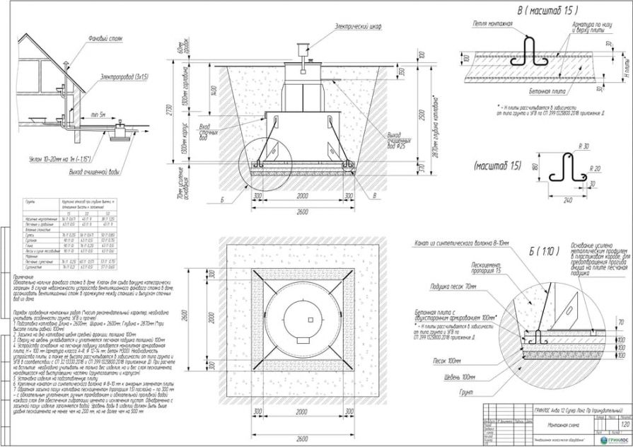 Целесообразно доверить выбор и монтаж оборудования специализированной компании. Перед непосредственным монтажом Оборудования специалисты осуществляют подготовку котлована. Его размеры определяются конструктивными особенностями выбранной модели оборудования. Ознакомиться с данными параметрами можно в приложении к ПС. По боковым стенкам корпуса должно быть сохранено свободное расстояние до грунта не менее 250 мм. Дно котлована нуждается в более тщательной подготовке. Его подвергают выравниванию с последующей засыпкой слоем песка, обладающим толщиной в пределах 10-15 см. Пазухи котлована подвергают обратной засыпке при помощи песка, который послойно поливают водой. Прежде чем приступить к аналогичным работам, емкость оборудования на четверть заполняют водой. Впоследствии количество воды внутри емкости увеличивают соразмерно уровню засыпки песком наружных стенок. Каждые 200 мм песка подвергаются ручному уплотнению.