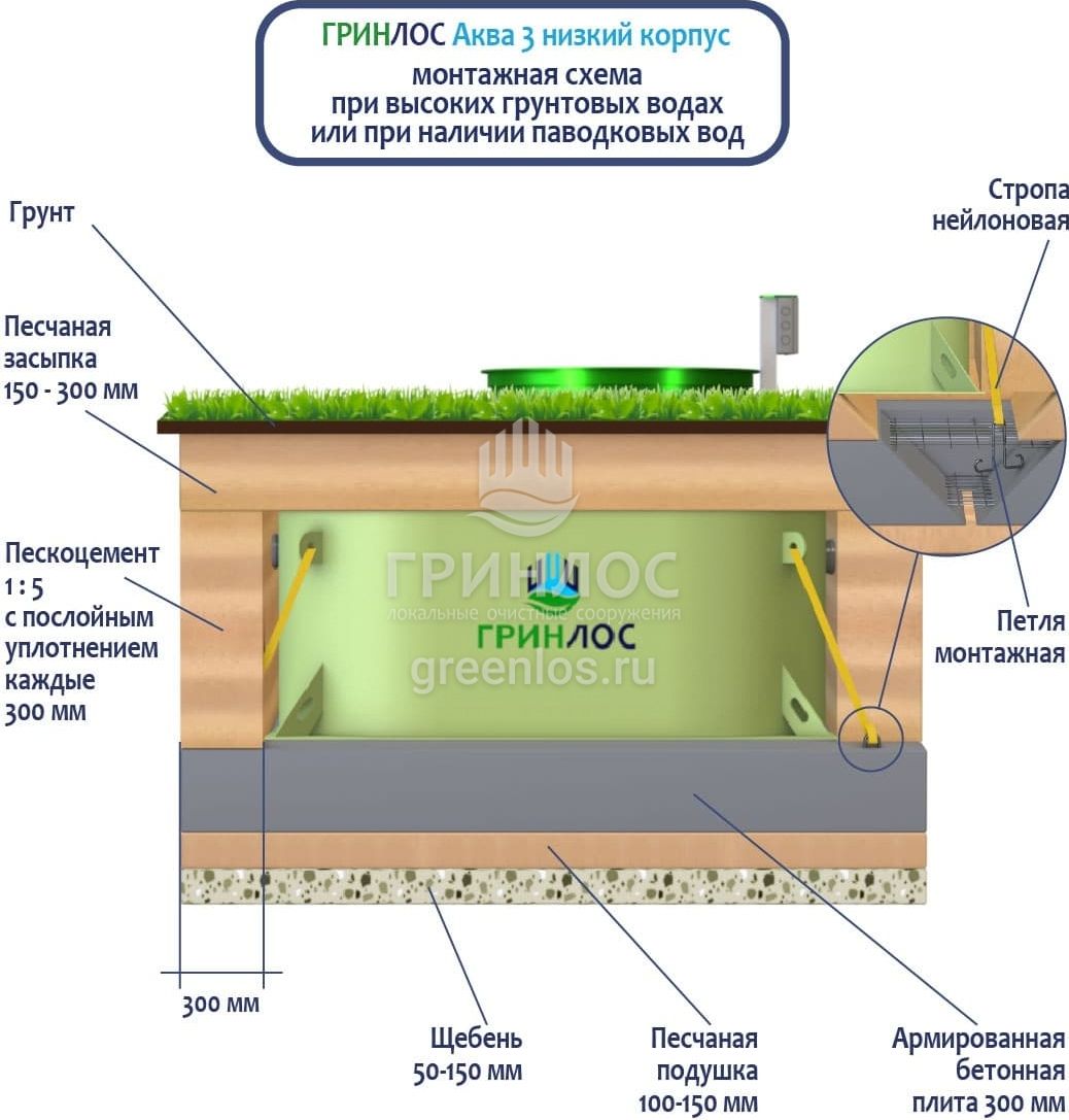 Станции очистки ГРИНЛОС обладают надежными грунтозацепами, действительно предотвращающими всплытие оборудования на обводненных участках.