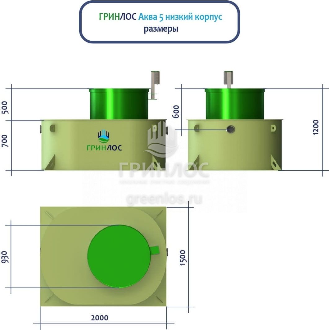ГРИНЛОС Аква 5 низкий корпус — это самотечная модель септика с уменьшенной высотой корпуса. Обладает объемом залпового сброса 440 л и производительностью 1 м3/сутки, что делает его подходящим для домов, в которых число жильцов не превышает 5 условных пользователей.
