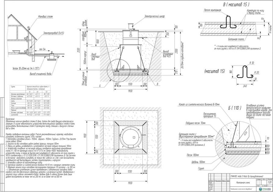 Целесообразно доверить выбор и монтаж оборудования специализированной компании. Перед непосредственным монтажом Оборудования специалисты осуществляют подготовку котлована. Его размеры определяются конструктивными особенностями выбранной модели оборудования. Ознакомиться с данными параметрами можно в приложении к ПС. По боковым стенкам корпуса должно быть сохранено свободное расстояние до грунта не менее 250 мм. Дно котлована нуждается в более тщательной подготовке. Его подвергают выравниванию с последующей засыпкой слоем песка, обладающим толщиной в пределах 10-15 см. Пазухи котлована подвергают обратной засыпке при помощи песка, который послойно поливают водой. Прежде чем приступить к аналогичным работам, емкость оборудования на четверть заполняют водой. Впоследствии количество воды внутри емкости увеличивают соразмерно уровню засыпки песком наружных стенок. Каждые 200 мм песка подвергаются ручному уплотнению.