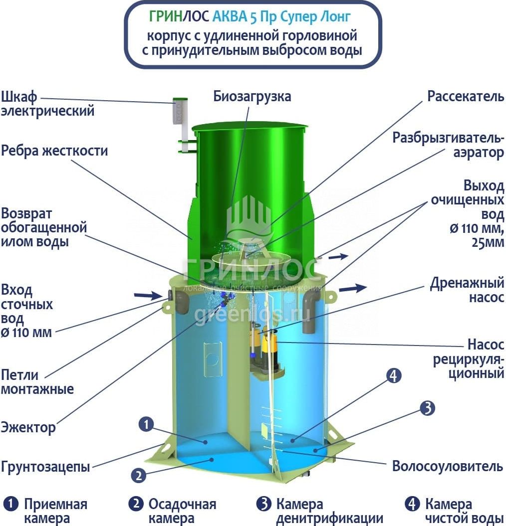 ГРИНЛОС Аква 5 Пр Супер Лонг – это бескомпрессорная станция переработки сточных вод. Конструкция данного септика позволяет принимать не более 440 л залпом, а производительность станции равна 1 м3/сутки. Септик подходит для комфортного проживания 5 человек.