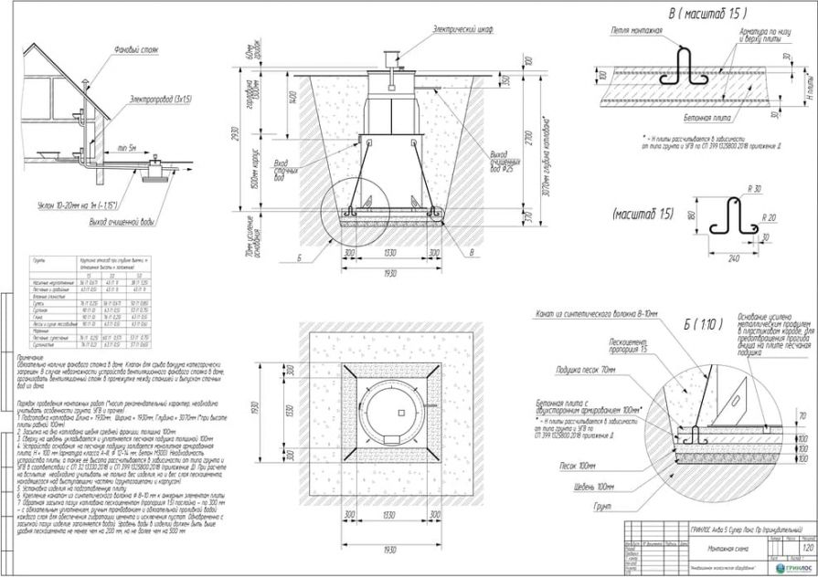 Целесообразно доверить выбор и монтаж оборудования специализированной компании. Перед непосредственным монтажом Оборудования специалисты осуществляют подготовку котлована. Его размеры определяются конструктивными особенностями выбранной модели оборудования. Ознакомиться с данными параметрами можно в приложении к ПС. По боковым стенкам корпуса должно быть сохранено свободное расстояние до грунта не менее 250 мм. Дно котлована нуждается в более тщательной подготовке. Его подвергают выравниванию с последующей засыпкой слоем песка, обладающим толщиной в пределах 10-15 см. Пазухи котлована подвергают обратной засыпке при помощи песка, который послойно поливают водой. Прежде чем приступить к аналогичным работам, емкость оборудования на четверть заполняют водой. Впоследствии количество воды внутри емкости увеличивают соразмерно уровню засыпки песком наружных стенок. Каждые 200 мм песка подвергаются ручному уплотнению.
