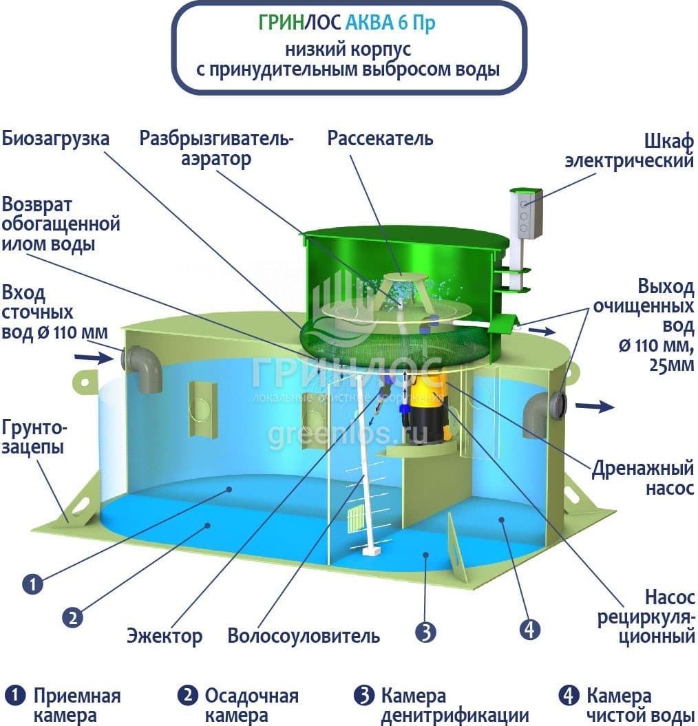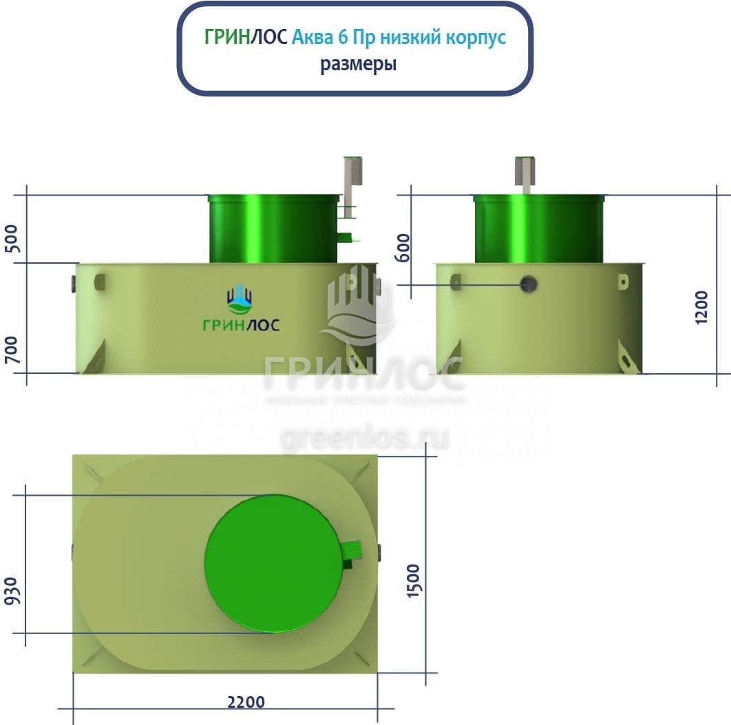 ГРИНЛОС Аква 6 низкий корпус Пр — модель септика с уменьшенной высотой корпуса, оснащенная насосом. Обладает объемом залпового сброса 540 л и производительностью 1.2 м3/сутки, что делает его подходящим для домов, в которых число жильцов не превышает 6 условных пользователей.