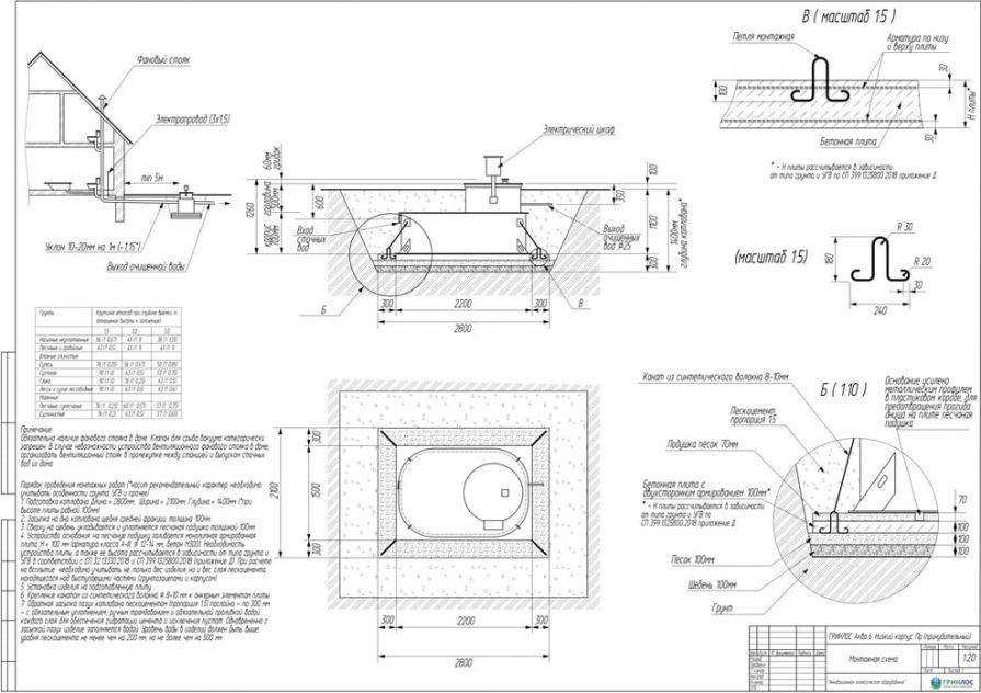 Целесообразно доверить выбор и монтаж оборудования специализированной компании. Перед непосредственным монтажом Оборудования специалисты осуществляют подготовку котлована. Его размеры определяются конструктивными особенностями выбранной модели оборудования. Ознакомиться с данными параметрами можно в приложении к ПС. По боковым стенкам корпуса должно быть сохранено свободное расстояние до грунта не менее 250 мм. Дно котлована нуждается в более тщательной подготовке. Его подвергают выравниванию с последующей засыпкой слоем песка, обладающим толщиной в пределах 10-15 см. Пазухи котлована подвергают обратной засыпке при помощи песка, который послойно поливают водой. Прежде чем приступить к аналогичным работам, емкость оборудования на четверть заполняют водой. Впоследствии количество воды внутри емкости увеличивают соразмерно уровню засыпки песком наружных стенок. Каждые 200 мм песка подвергаются ручному уплотнению.