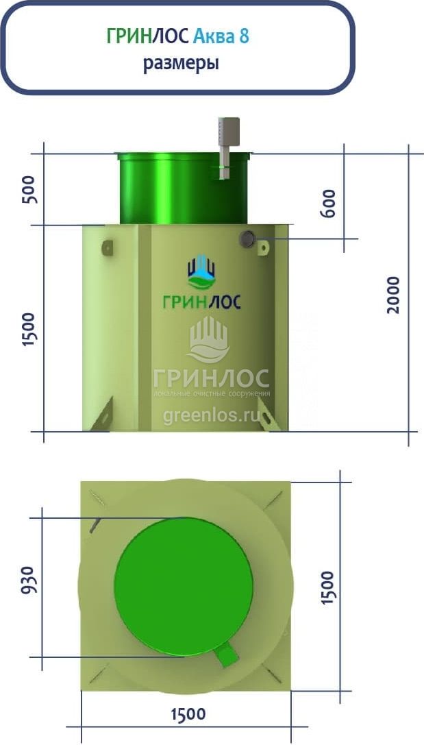 ГРИНЛОС Аква 8 — это самотечная модель септика с залповым сбросом 710 л и производительностью 1.4 м3/сутки, что делает его подходящим для домов, в которых число жильцов не превышает 8 условных пользователей.
