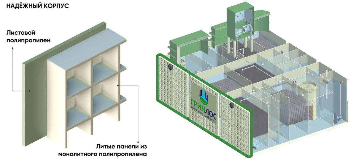 Корпус блочно-модульного септика Гринлос БМ Пром из полипропилена служит более 50 лет без коррозии и разрушения.