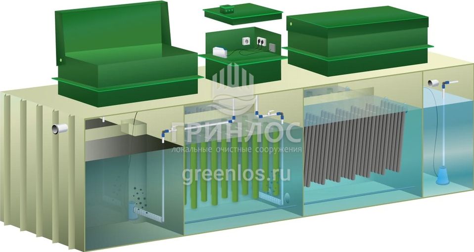 ГРИНЛОС БМ 75– это очистное сооружение производительностью 21 м3 в сутки, состоящее из нескольких разнофункциональных блоков, находящихся в специально сконструированном корпусе длиной 4,16 метров и высотой 2,58 метров, предназначенных для полной очистки промышленных, бытовых и ливневых стоков от любых видов загрязнений.