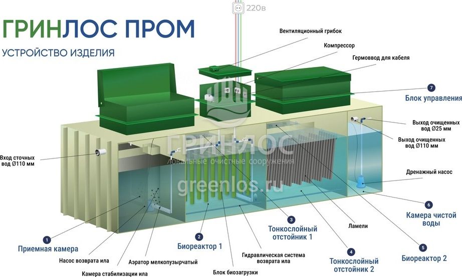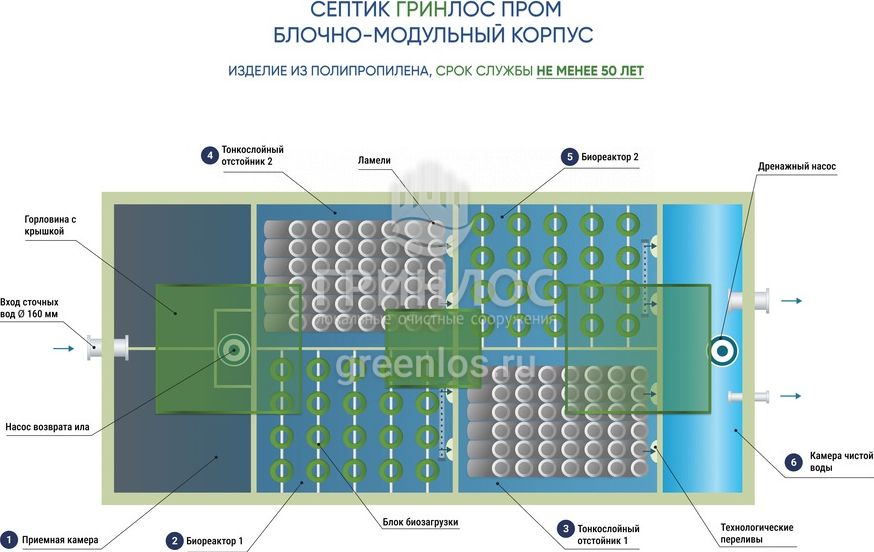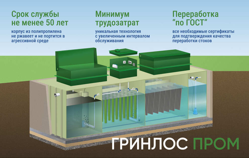 В станциях ГРИНЛОС блочно-модульного типа производится глубокая биохимическая очистка с помощью биоценоза автогетеротрофных штаммов бактерий, связывающих загрязнитель в хлопья твёрдого ила на стадии прохождения жидкости через анаэробные реакторы.