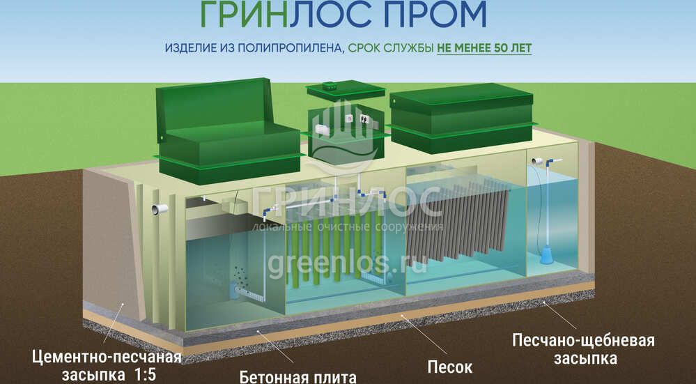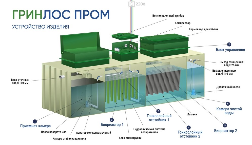 Конструкция камер-переливов в ГРИНЛОС БМ 75 устроена таким образом, чтобы тракт очистки шёл самоотёком, на каждой ступени оседали тяжёлые взвешенные частицы.