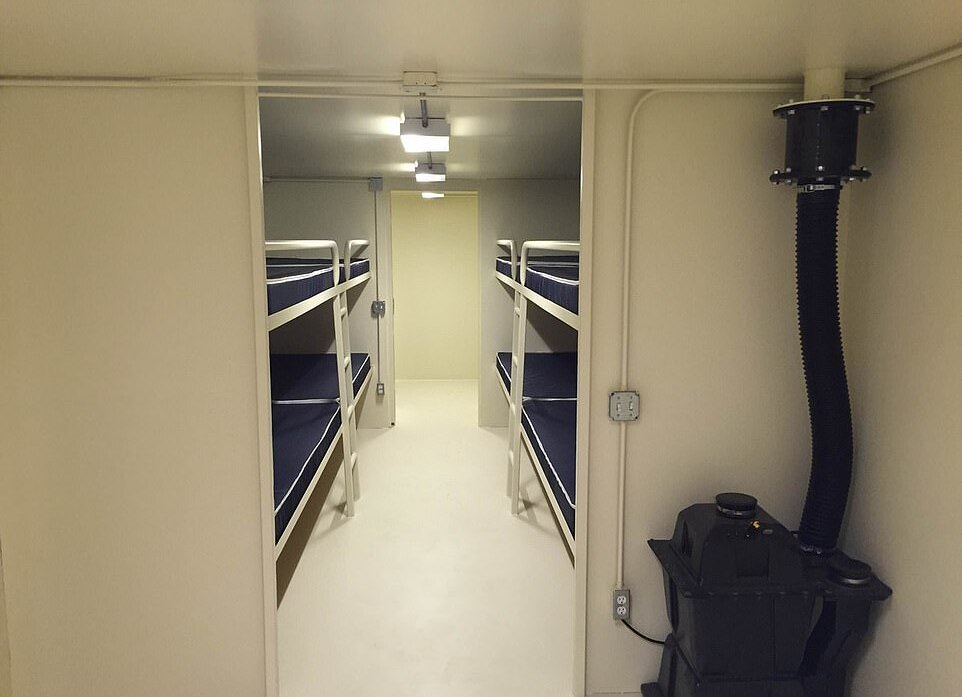 Бункер может быть оснащен дополнительным тамбуром и иметь несколько отдельных помещений. Оснащен большим количеством полок, которые выдерживают до 150 кг. В зависимости от модели погреба хватит места для хранения продуктов питания на семью из трех человек от 3 до 12 месяцев.