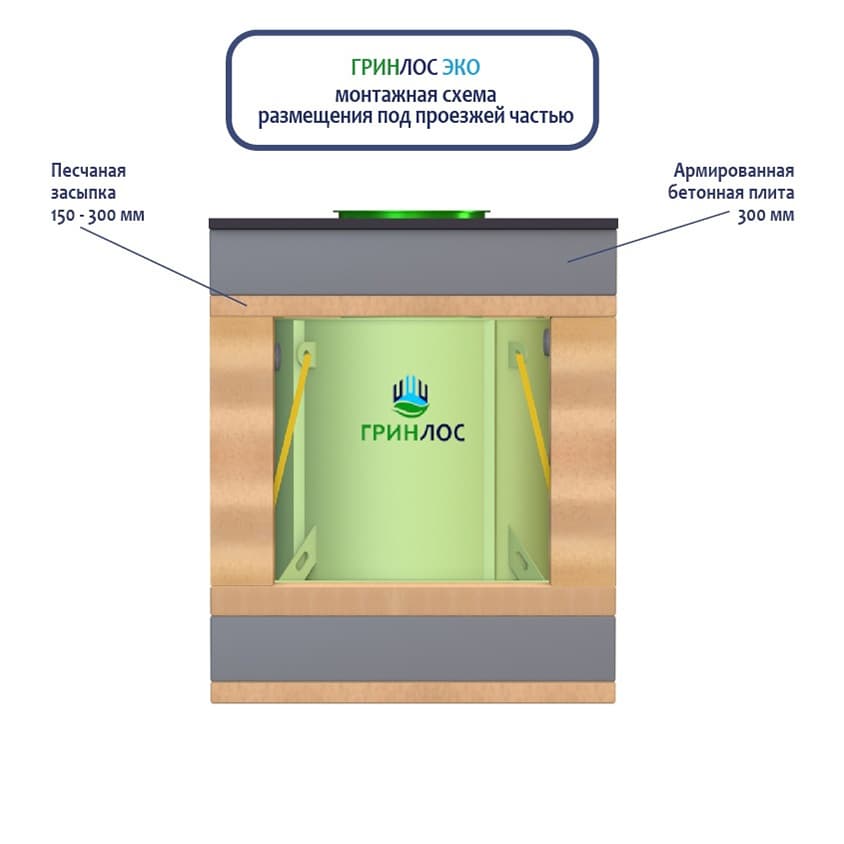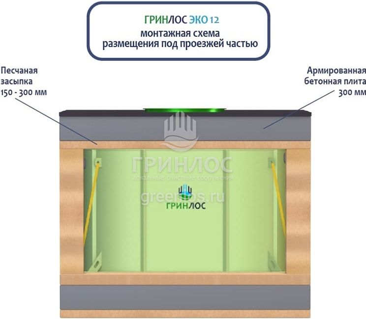 Септик глубокой биохимической переработки хозяйственно-бытовых сточных вод ГРИНЛОС Эко 12 следует располагать так, чтобы к ней мог беспрепятственно подъехать ассенизационный автомобиль. При этом над отстойником и над Септиком ГРИНЛОС Эко в радиусе 2,5 м не допускается движение и стоянка автотранспорта. При необходимости организации стоянки или проезда автотранспорта, необходимо оборудовать разгрузочную плиту над очистным сооружением и над подводящей и отводящей трассами.