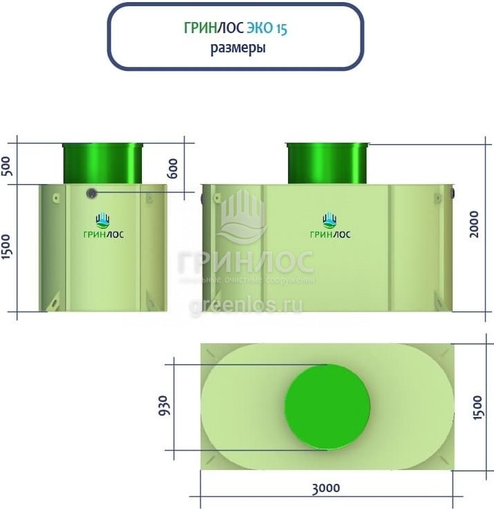 ГРИНЛОС Эко 15 — это энергонезависимый септик с залповым сбросом 770 л и производительностью 3 м3/сутки, что делает его подходящим для домов, в которых число жильцов не превышает 15 условных пользователей.