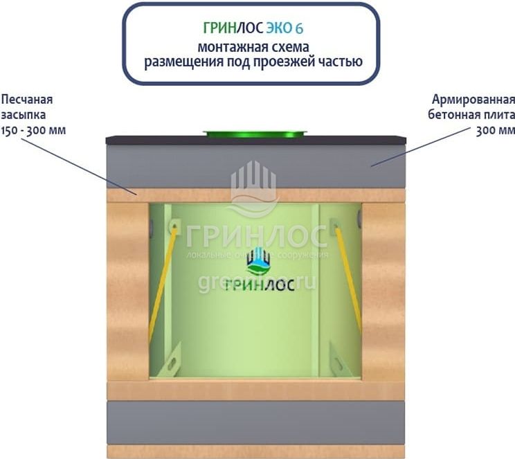 Септик глубокой биохимической переработки хозяйственно-бытовых сточных вод ГРИНЛОС Эко 6 следует располагать так, чтобы к ней мог беспрепятственно подъехать ассенизационный автомобиль. При этом над отстойником и над Септиком ГРИНЛОС Эко в радиусе 2,5 м не допускается движение и стоянка автотранспорта. При необходимости организации стоянки или проезда автотранспорта, необходимо оборудовать разгрузочную плиту над очистным сооружением и над подводящей и отводящей трассами.