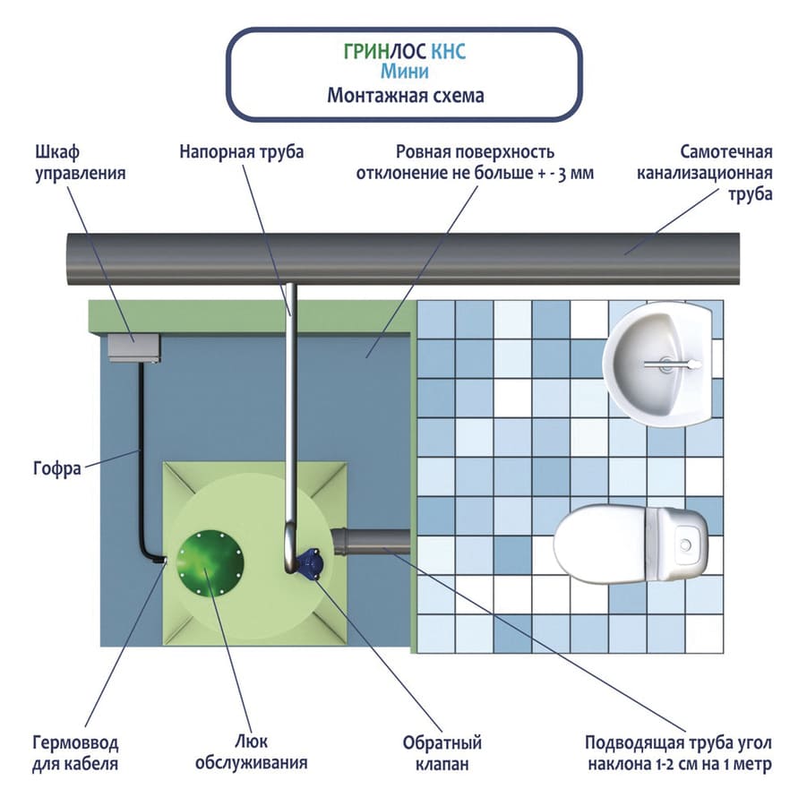 Установка Мини КНС Гринлос осуществляется не на участке, а в жилых помещениях. Поэтому нет необходимости в земельных работах, КНС ставится на ровный пол, и система включается в работу.