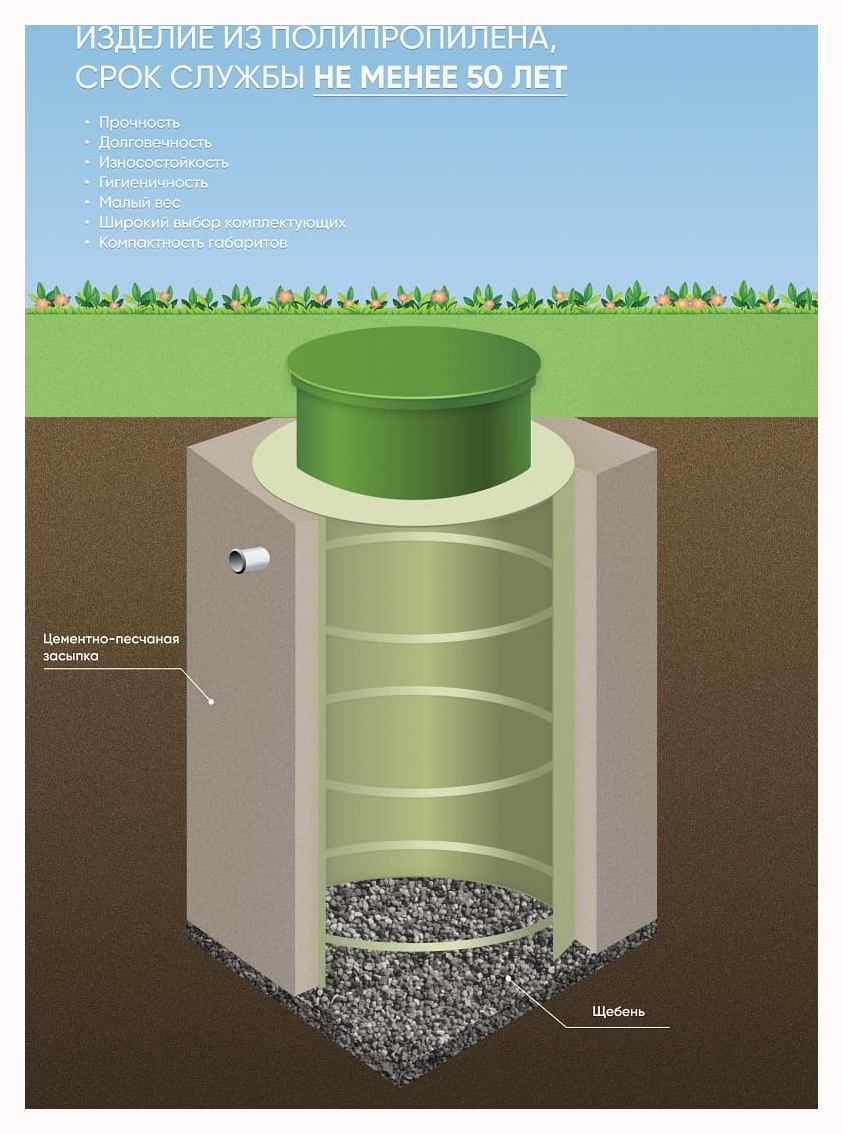 Полипропилен не корродирует при контакте с грунтом и водой. Стойки к перепадам температуры и солнечному свету. Не теряет качеств на протяжении всего периода эксплуатации.