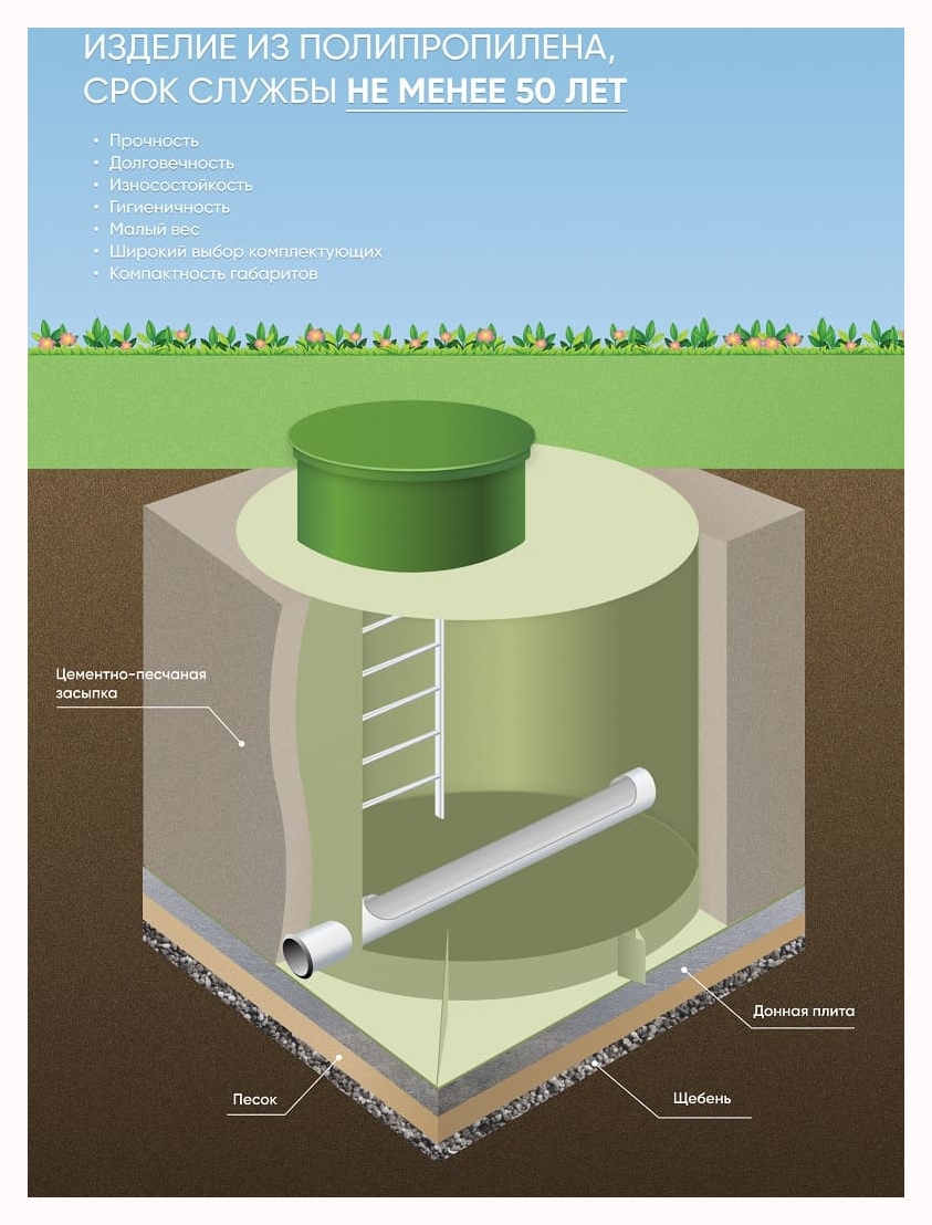 Конструкция изготавливается герметичной и не позволяет стокам проникнуть в почву, а отверстие в люке не даёт накапливаться избыточному давлению газа.