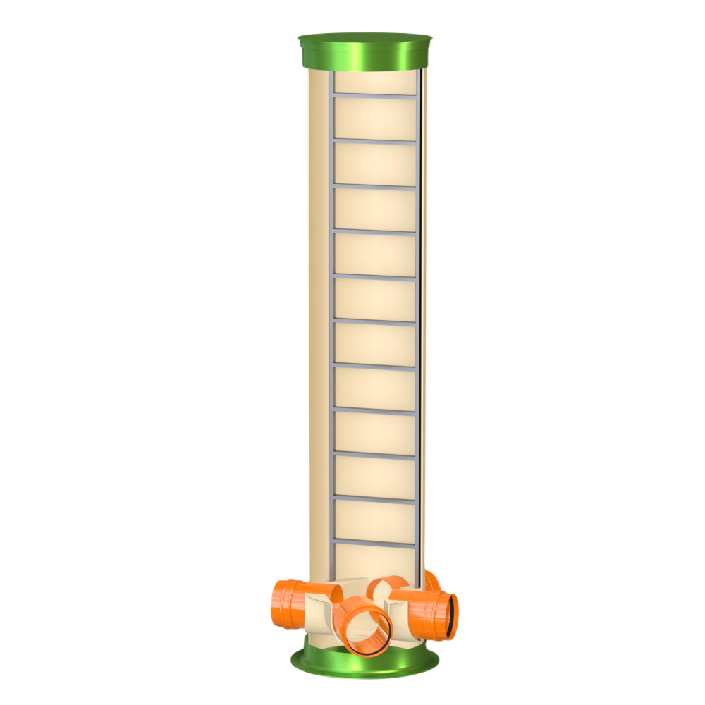 Узловой колодец ГРИНЛОС У 800/4000 устанавливается в местах соединения различных потоков. Такие колодцы могут выполнять функции как поворотных, так и перепадных колодцев одновременно. Чаще всего узловой колодец используется в качестве распределительного в системах очистных сооружений, которые состоят из нескольких модулей, для равномерного распределения потока между этими модулями.