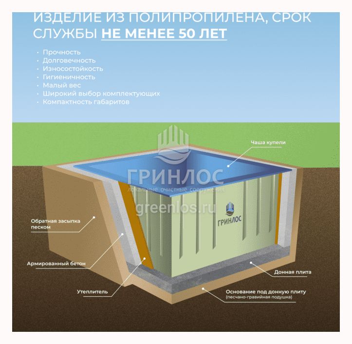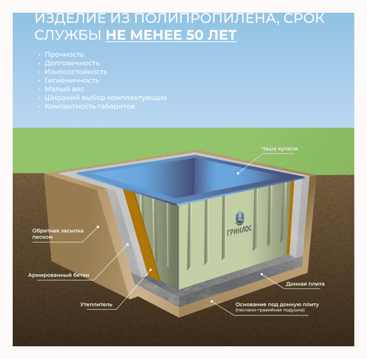 Особенности ГРИНЛОС Купель 2000*2000*1200 Прямоугольная