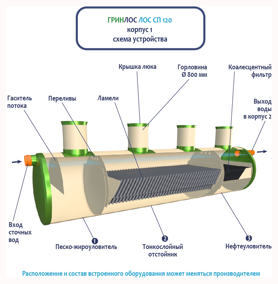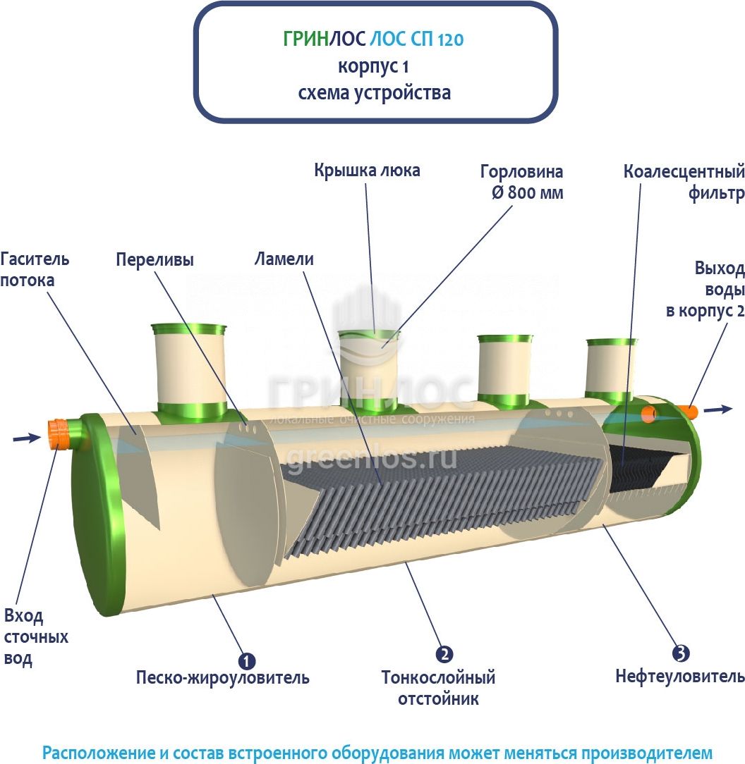 В базовую комплектацию Ливневой канализации Гринлос входит нефтеловушка, которая работает по принципу отстаивания стоков