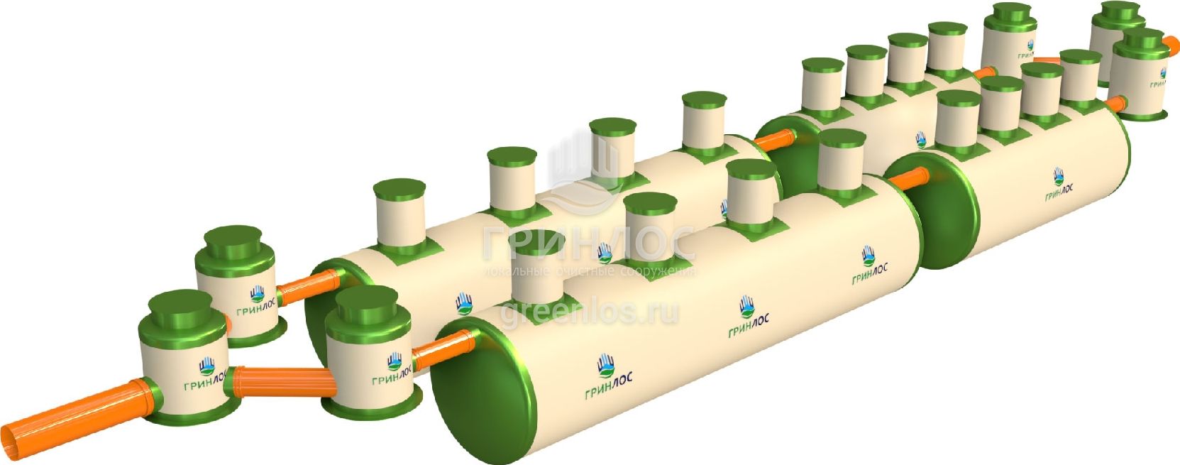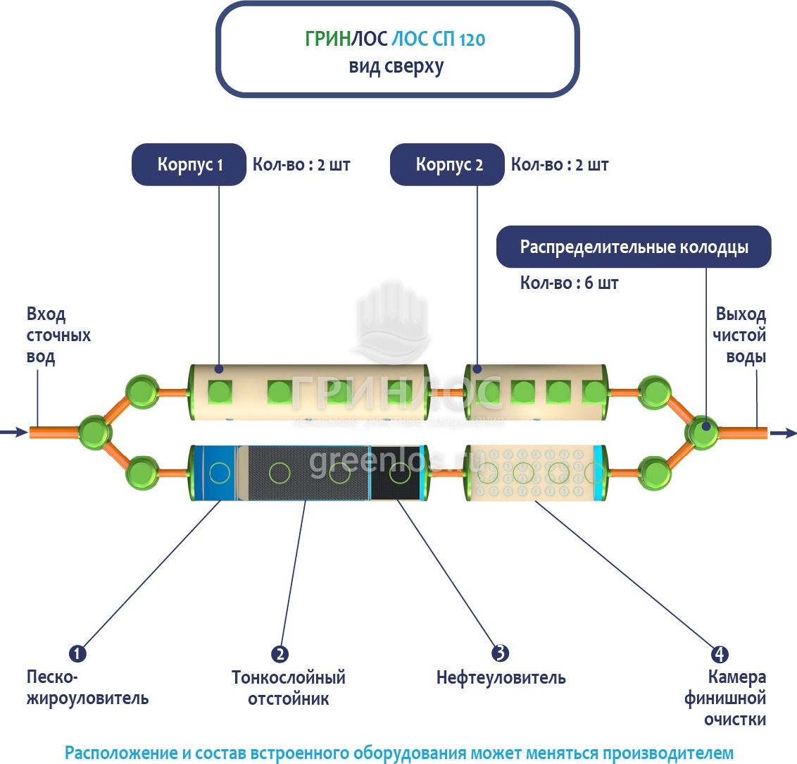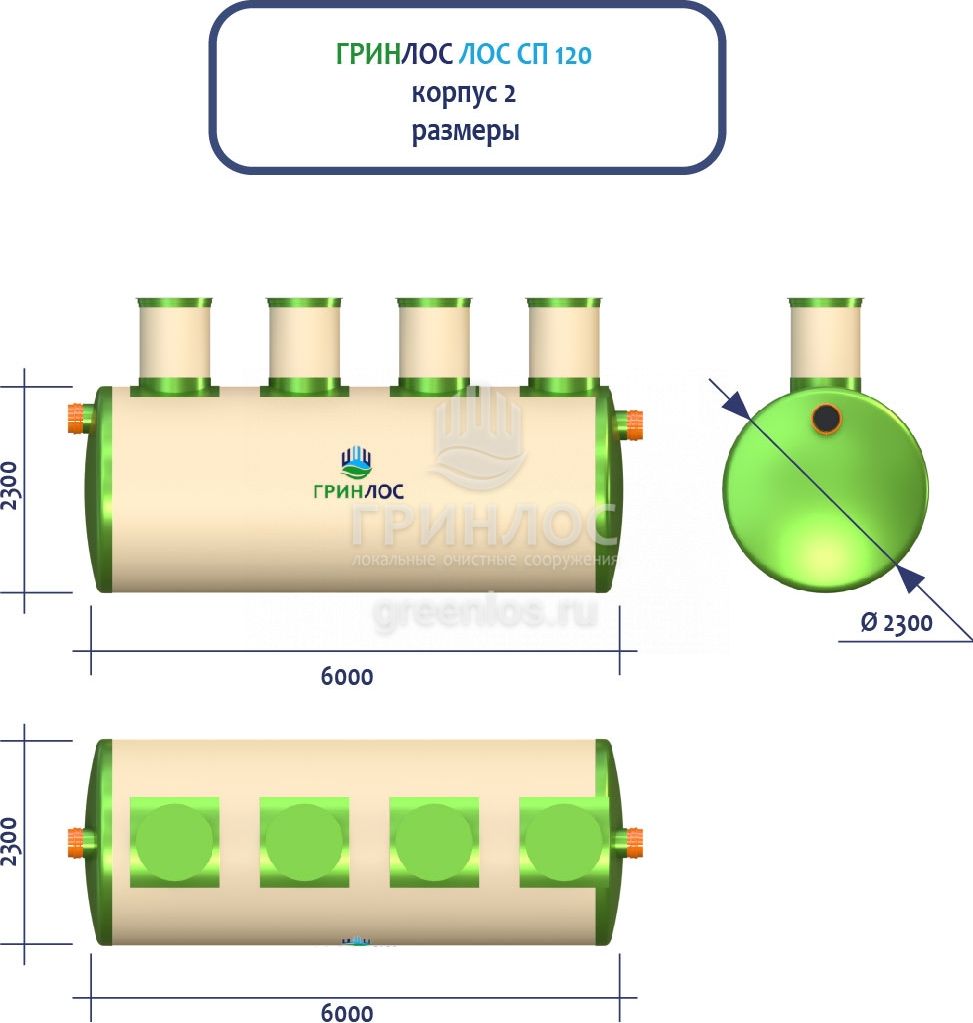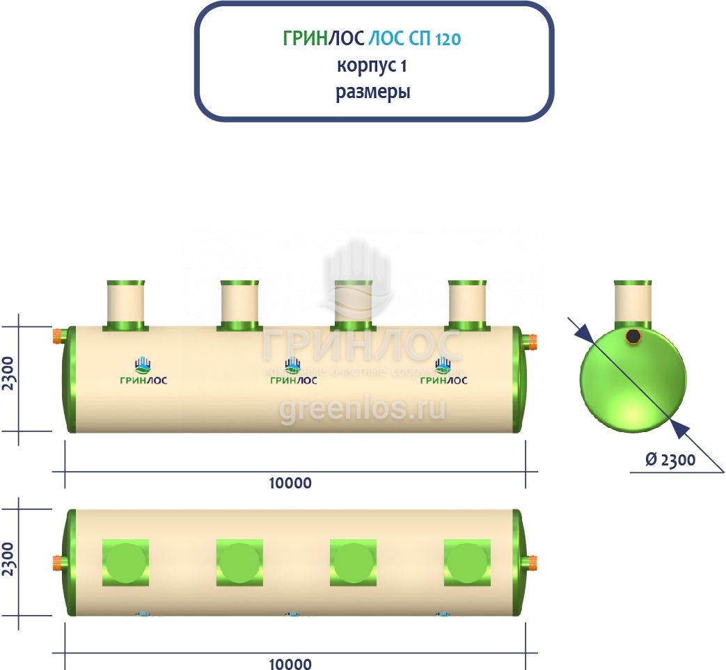 ГРИНЛОС Ливневая канализация 120-2300-2 стеклопластиковая представляет собой модульное очистное сооружение, состоящее из 4 корпусов размерами 10000*2300*2300 мм - 2 корпуса, 6000*2300*2300 мм - 2 корпуса. Объем отдельного корпуса 1 вида составляет 41.55 м3, 2 вида – 24.9 м3. Ввиду большого веса, для установки станции потребуется применение вспомогательного оборудования.