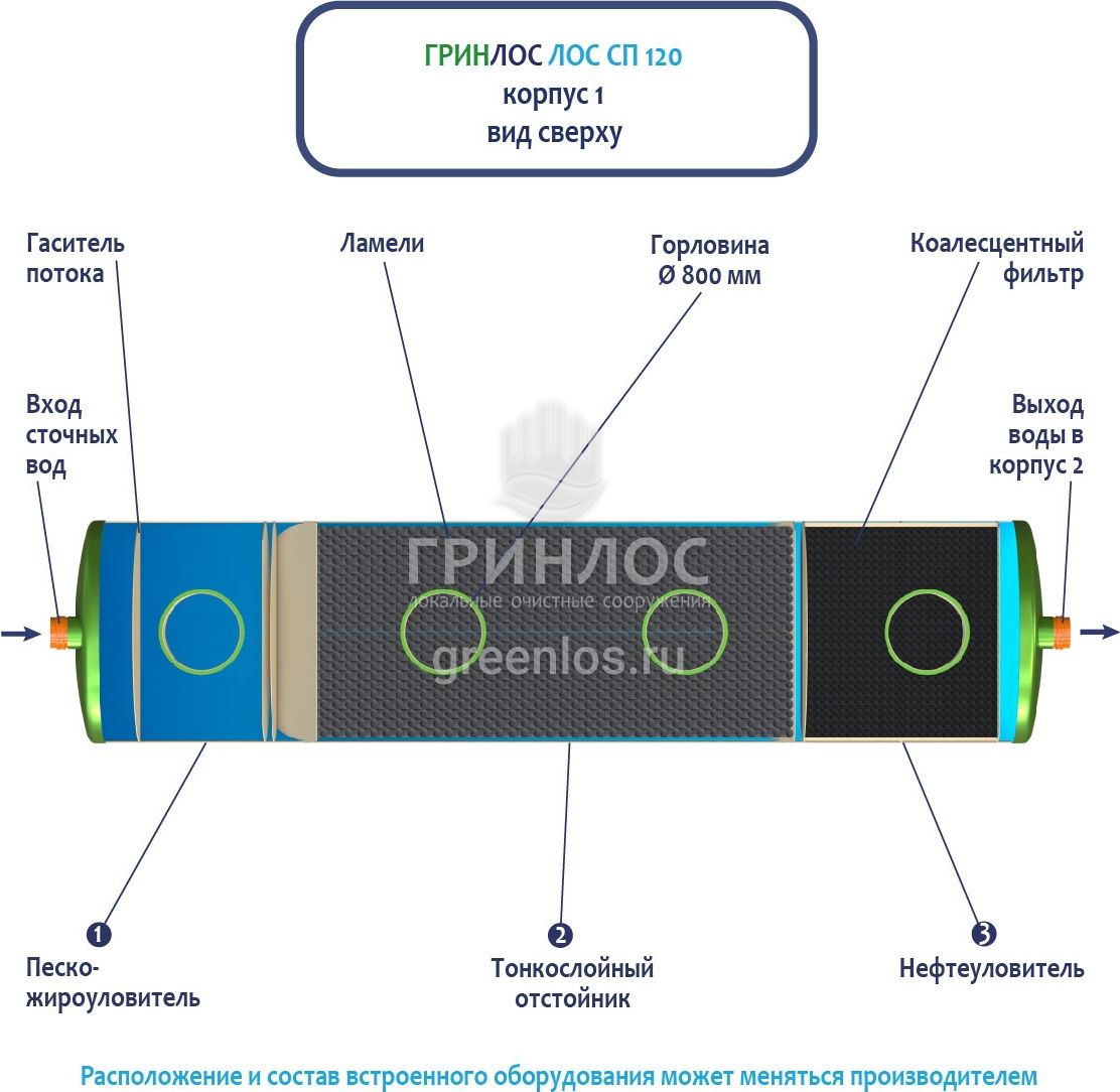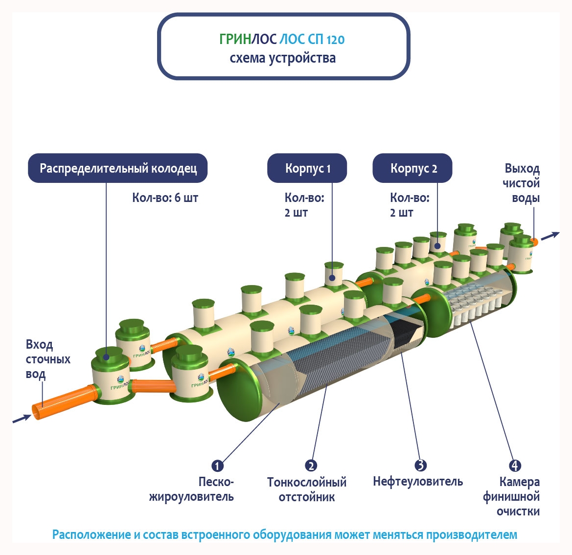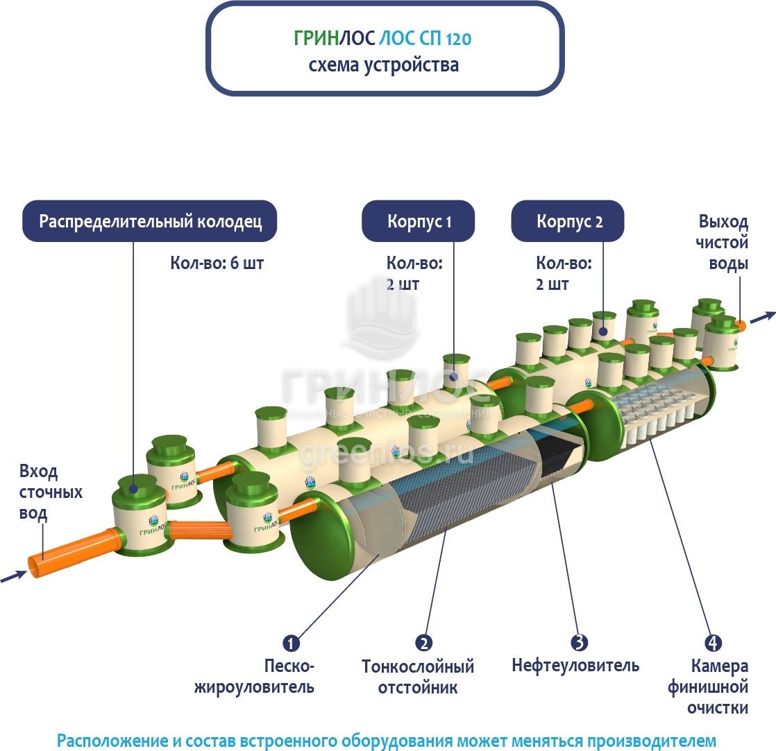 ГРИНЛОС Ливневая канализация 120-2300-2 стеклопластиковая представляет собой модульное очистное сооружение, состоящее из 4 корпусов размерами 10000*2300*2300 мм - 2 корпуса, 6000*2300*2300 мм - 2 корпуса. Объем отдельного корпуса 1 вида составляет 41.55 м3, 2 вида – 24.9 м3. Ввиду большого веса, для установки станции потребуется применение вспомогательного оборудования.