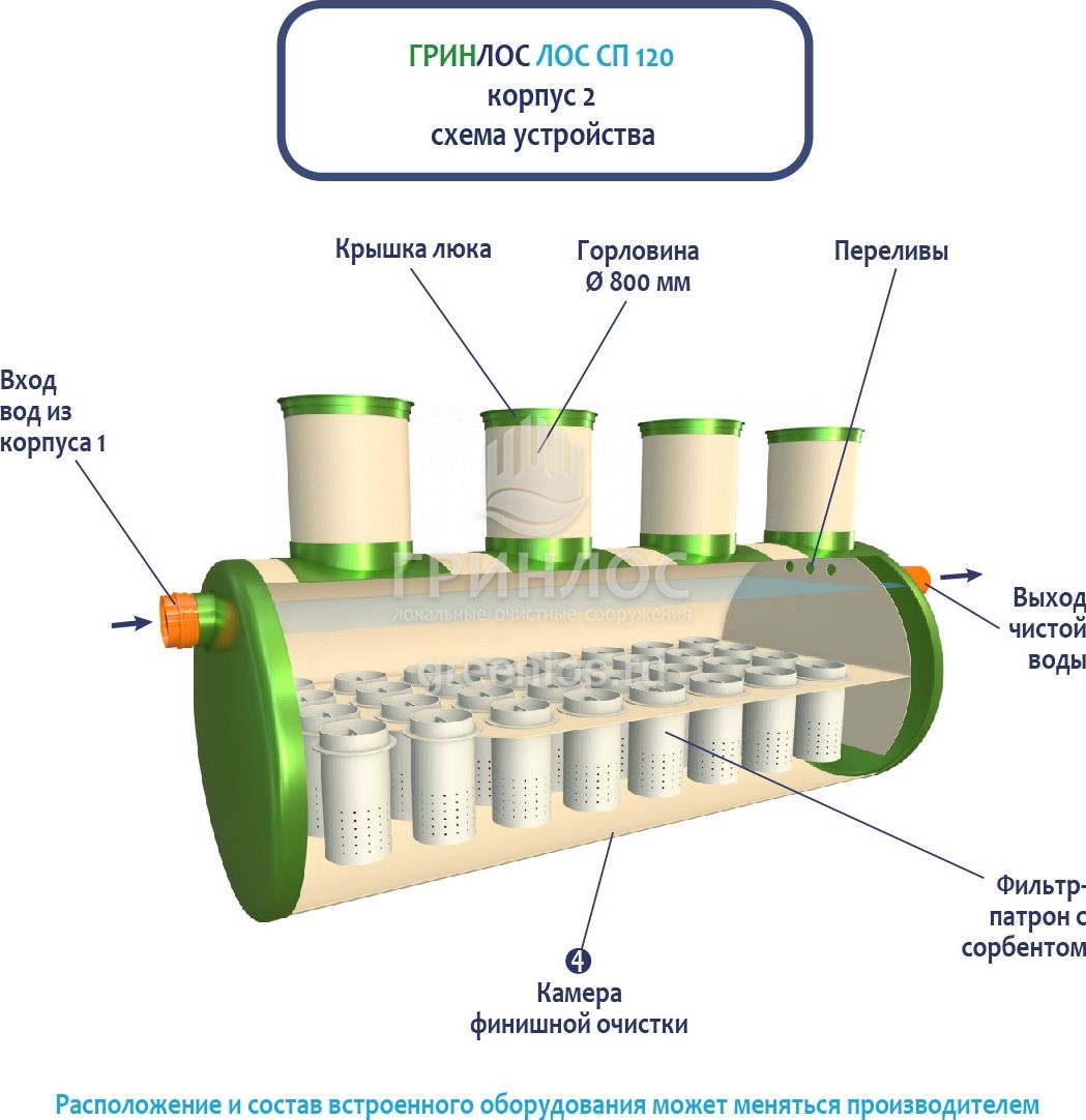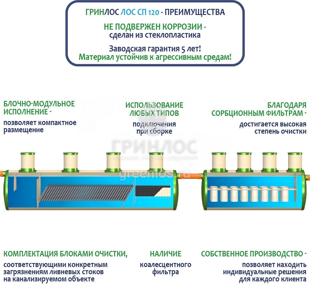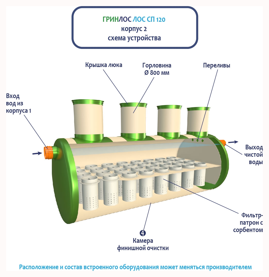 Ливневая канализация Гринлос ЛК 120-2300-2 Сп снабжена отсеком, в котором стоки проходят окончательную очистку через фильтр-патрон с сорбентом.