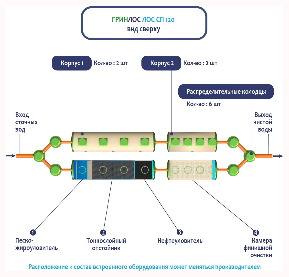 Конструктивно данное сооружение для очистки поверхностных вод представляет собой горизонтальную цилиндрическую ёмкость, разделенную внутри перегородками на отдельные блоки. Остальные блоки являются вертикальными или горизонтальными емкостными сооружениями, имеющими в своем составе перегородки, насосное оборудование, трубопроводы с запорной арматурой и лестницами для обслуживания.