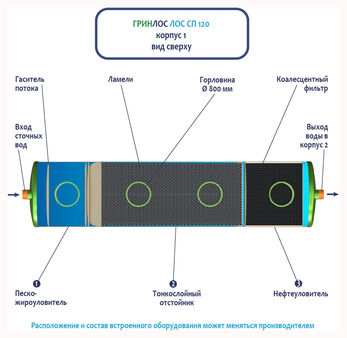 Стоки через входной патрубок корпуса Гринлос ГРИНЛОС Ливневая канализация 120-2300-2 стеклопластиковая попадают в песко-жироуловитель, где под воздействием седиментации из стоков выделяются взвеси и маслянистые вещества, за счет разницы плотностей твердые частицы оседают на дно, жиры собираются на поверхности.