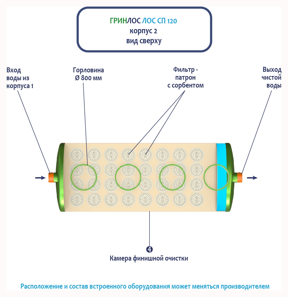Далее стоки попадают в камеру финишной очистки ливневой канализации ГРИНЛОС Ливневая канализация 120-2300-2 стеклопластиковая и проходят через фильтр-патрон с сорбентом.