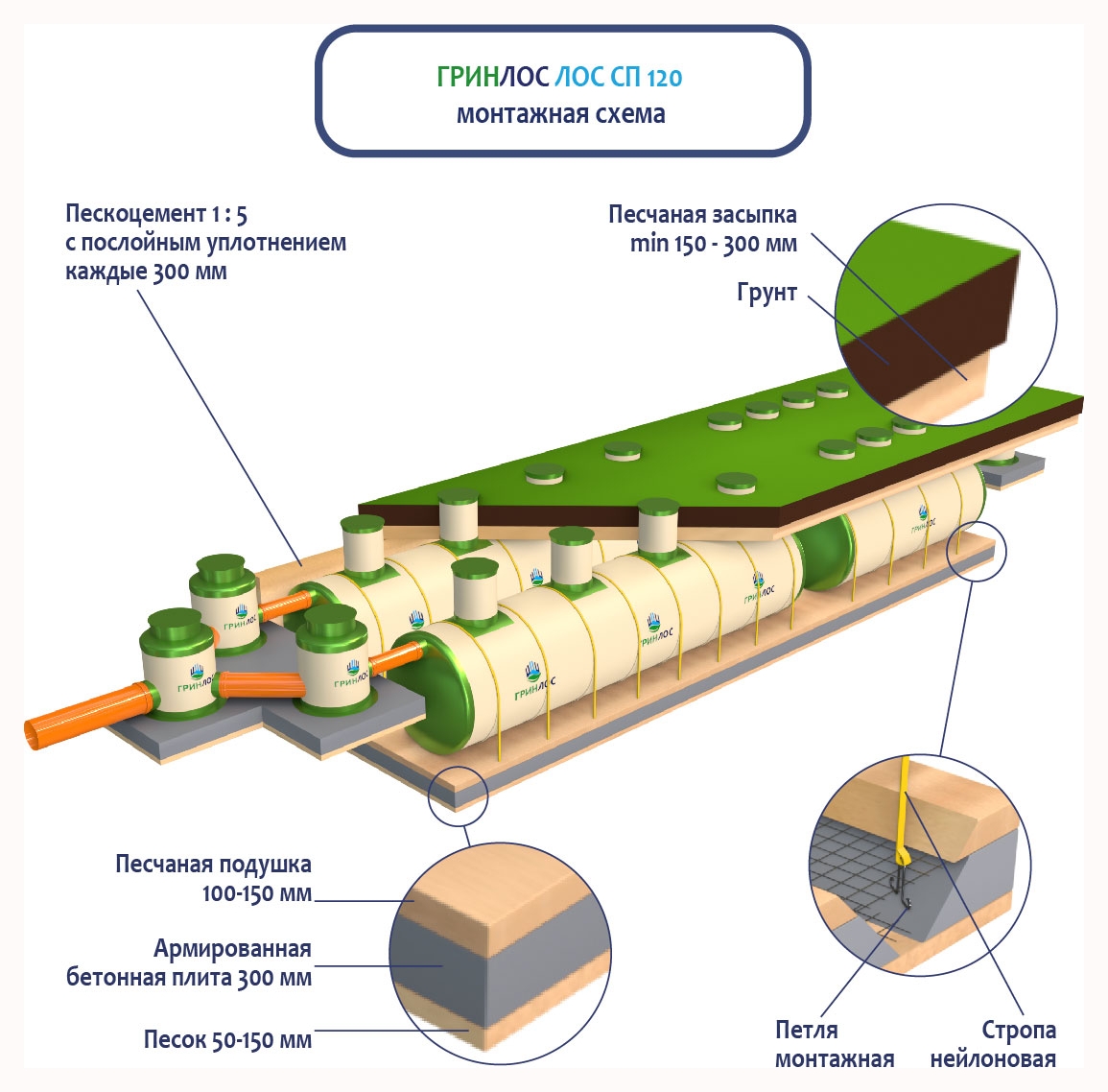 При заглублении ЛОС из стеклопластика на глубину не более 250 мм от верхнего пластикового горизонтального перекрытия до запланированного уровня земли, в однородных грунтах с низким уровнем вод обратную обсыпку допустимо производить песком, смешанным с цементом (марка не ниже М500). Соотношение цемента и песка для обсыпки составляет 1:5. Песчано-цементная засыпка производится послойно, с обязательным трамбованием и проливкой водой каждого слоя. Толщина каждого слоя 300 мм. При условии уровня грунтовых вод выше 1500 мм от уровня земли, при наличии плывуна, скальных грунтов и прочих нестандартных ситуациях, а также в случае заглубления ЛК 120-2300-2 Сп более чем на 250 мм песчано-цементную смесь необходимо заменить бетоном. Одновременно с засыпкой ливневой канализации, она заполняется водой. Уровень воды должен превышать уровень засыпки (бетонирования) не менее, чем на 200 мм и не более, чем на 500 мм.