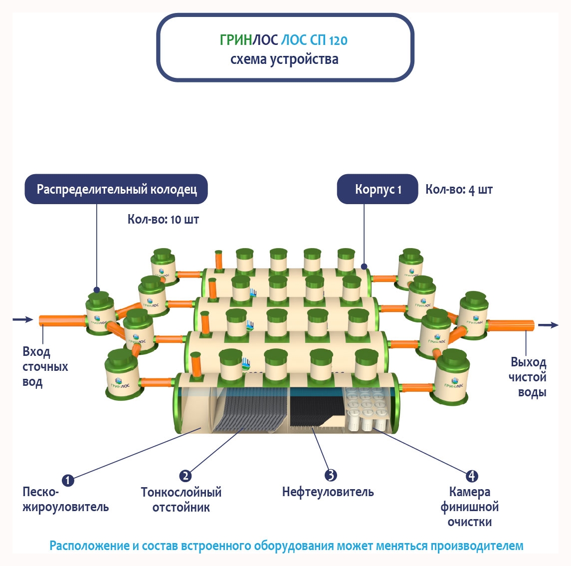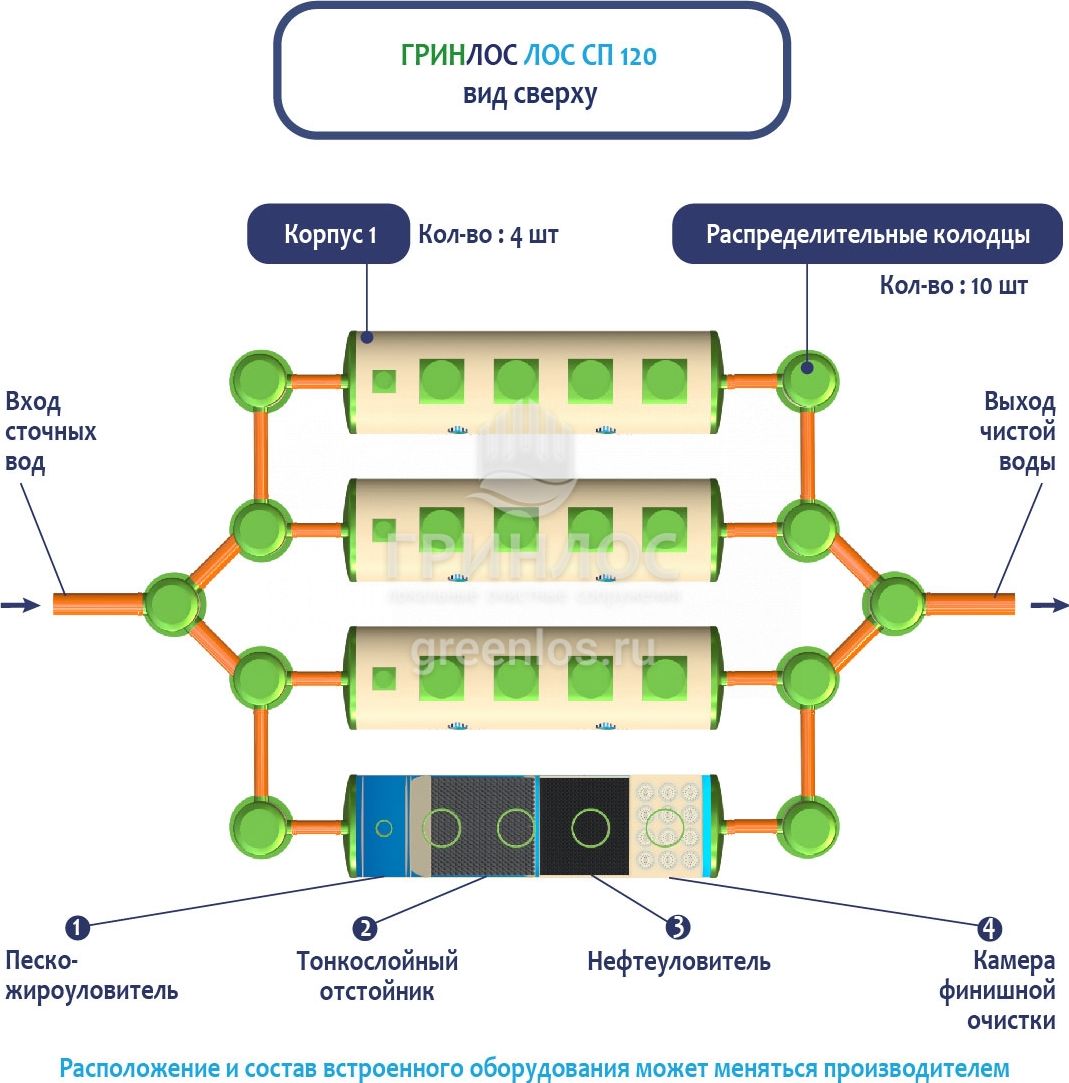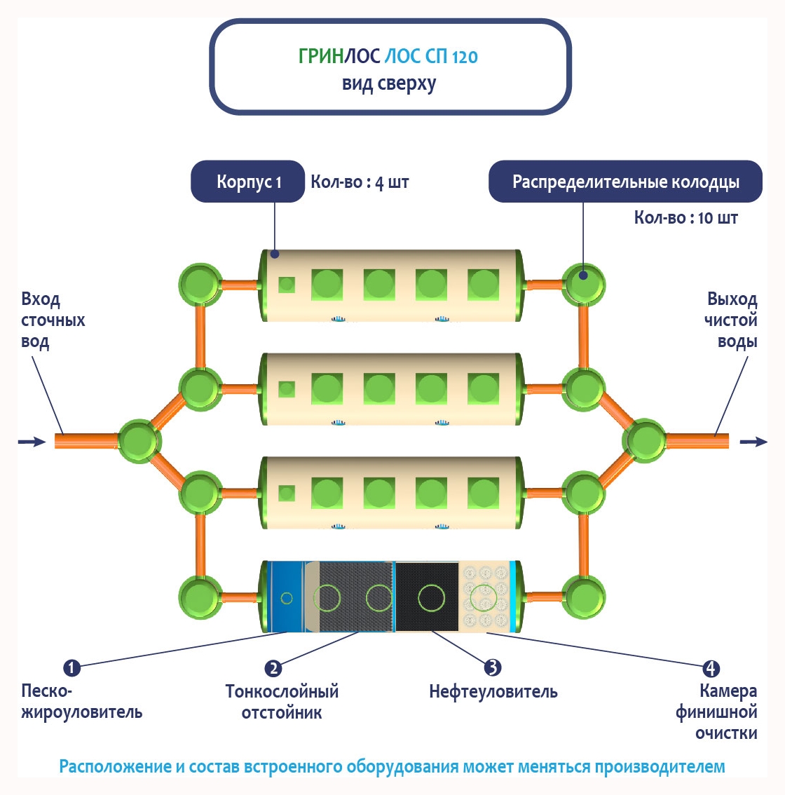 В Ливневой канализации ГРИНЛОС на 120м3 применяется классический принцип очистки дождевых и талых вод, заключающийся в поэтапном прохождении стоков через четыре отсека: