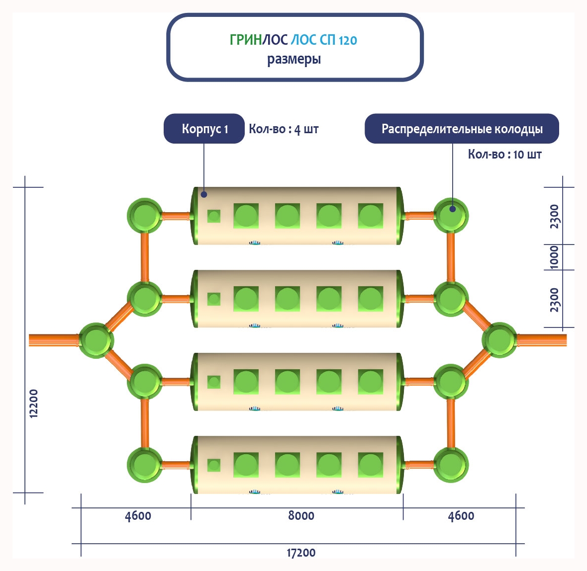 ГРИНЛОС Ливневая канализация 120-2300 стеклопластиковая представляет собой очистное сооружение ливневых стоков габаритами 8000*2300*2300 мм - 4 корпуса. Общий объем корпусов составляет 132.9 м3. Для установки станции потребуется применение вспомогательного оборудования.