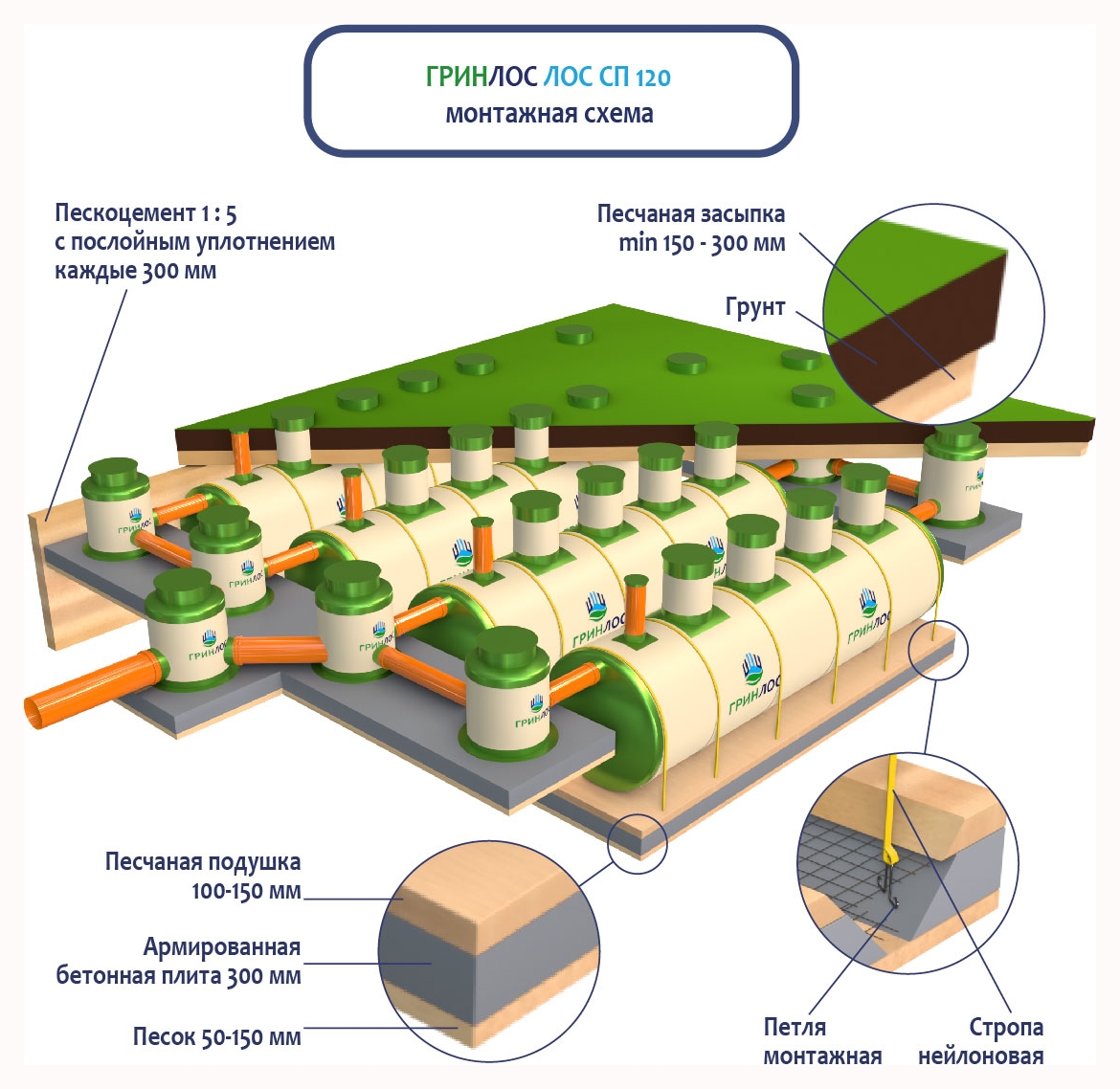 При заглублении ЛОС из стеклопластика на глубину не более 250 мм от верхнего пластикового горизонтального перекрытия до запланированного уровня земли, в однородных грунтах с низким уровнем вод обратную обсыпку допустимо производить песком, смешанным с цементом (марка не ниже М500). Соотношение цемента и песка для обсыпки составляет 1:5. Песчано-цементная засыпка производится послойно, с обязательным трамбованием и проливкой водой каждого слоя. Толщина каждого слоя 300 мм. При условии уровня грунтовых вод выше 1500 мм от уровня земли, при наличии плывуна, скальных грунтов и прочих нестандартных ситуациях, а также в случае заглубления ЛК 120-2300 Сп более чем на 250 мм песчано-цементную смесь необходимо заменить бетоном. Одновременно с засыпкой ливневой канализации, она заполняется водой. Уровень воды должен превышать уровень засыпки (бетонирования) не менее, чем на 200 мм и не более, чем на 500 мм.