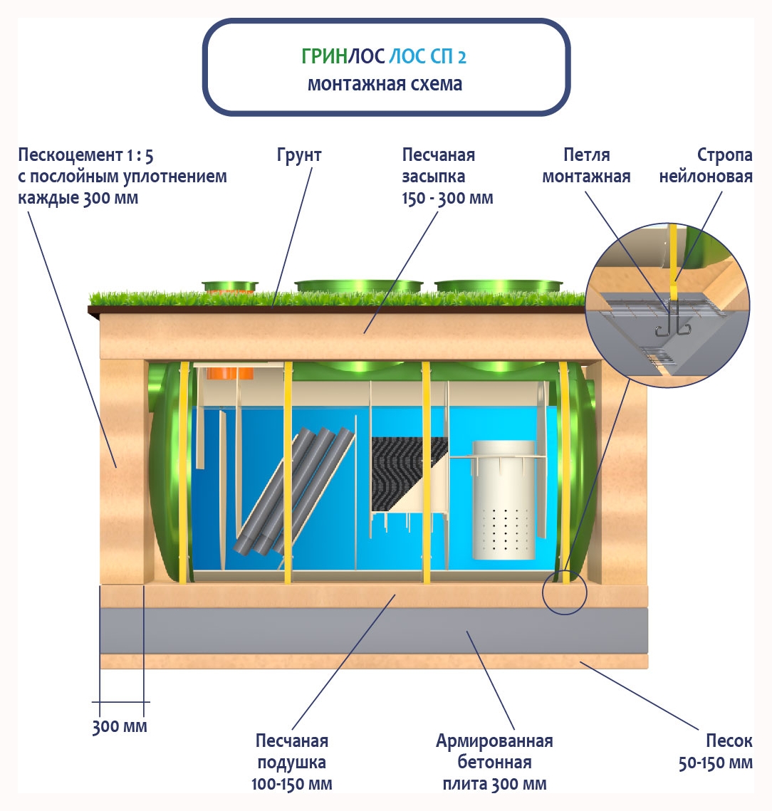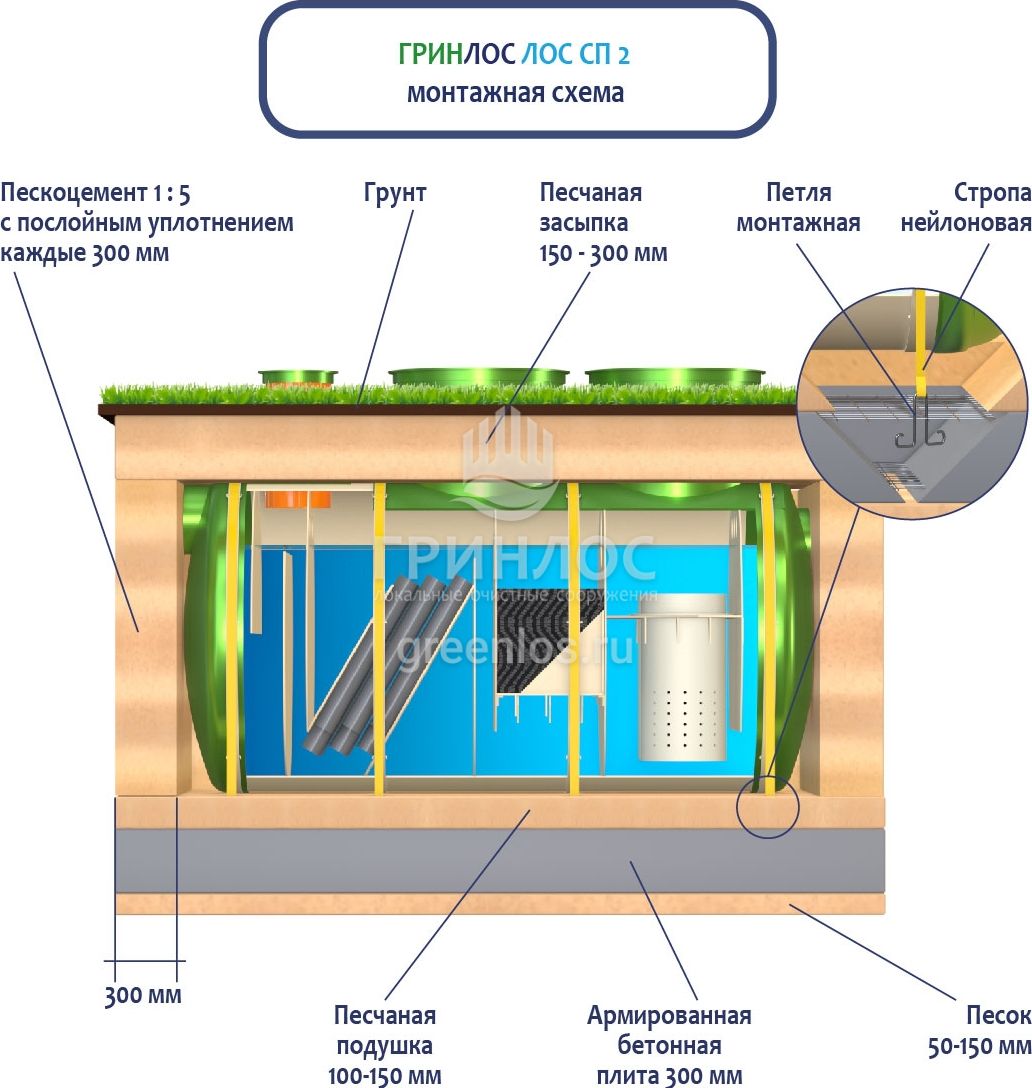 При заглублении ЛОС из стеклопластика на глубину не более 250 мм от верхнего пластикового горизонтального перекрытия до запланированного уровня земли, в однородных грунтах с низким уровнем вод обратную обсыпку допустимо производить песком, смешанным с цементом (марка не ниже М500). Соотношение цемента и песка для обсыпки составляет 1:5. Песчано-цементная засыпка производится послойно, с обязательным трамбованием и проливкой водой каждого слоя. Толщина каждого слоя 300 мм. При условии уровня грунтовых вод выше 1500 мм от уровня земли, при наличии плывуна, скальных грунтов и прочих нестандартных ситуациях, а также в случае заглубления ЛК 2-1500 Сп более чем на 250 мм песчано-цементную смесь необходимо заменить бетоном. Одновременно с засыпкой ливневой канализации, она заполняется водой. Уровень воды должен превышать уровень засыпки (бетонирования) не менее, чем на 200 мм и не более, чем на 500 мм.