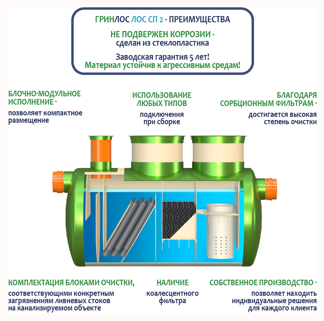Гринлос ЛК 2-1500 Сп выполнена из стеклопластика – инертного материала, устойчивого к агрессивным средам.