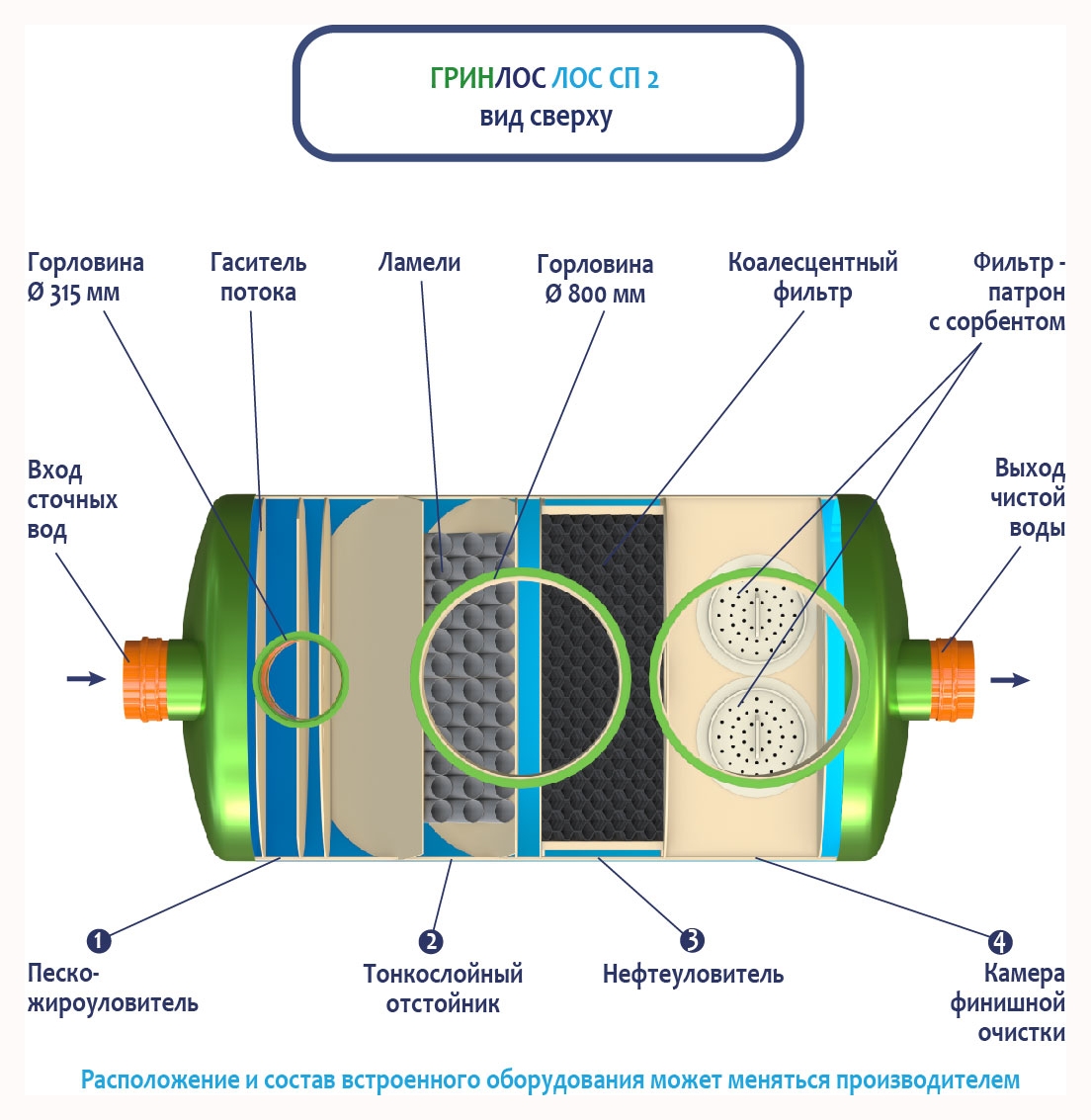 В Ливневой канализации ГРИНЛОС на 2м3 применяется классический принцип очистки дождевых и талых вод, заключающийся в поэтапном прохождении стоков через четыре отсека: