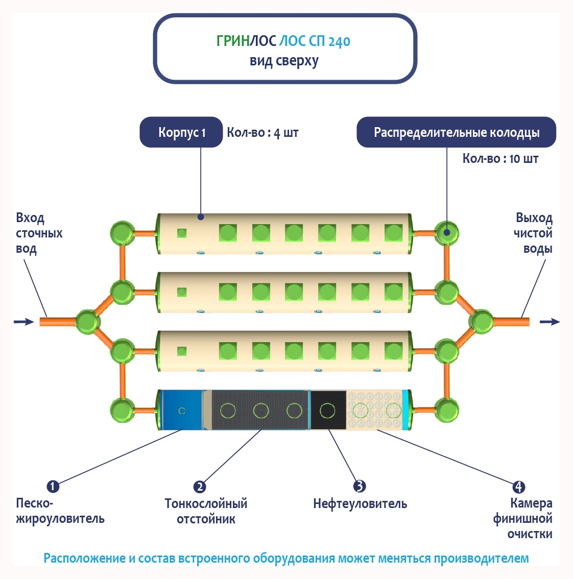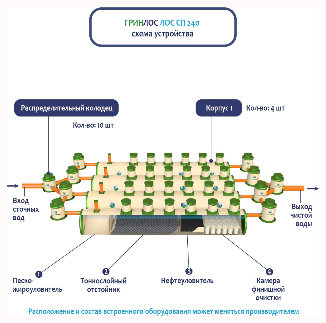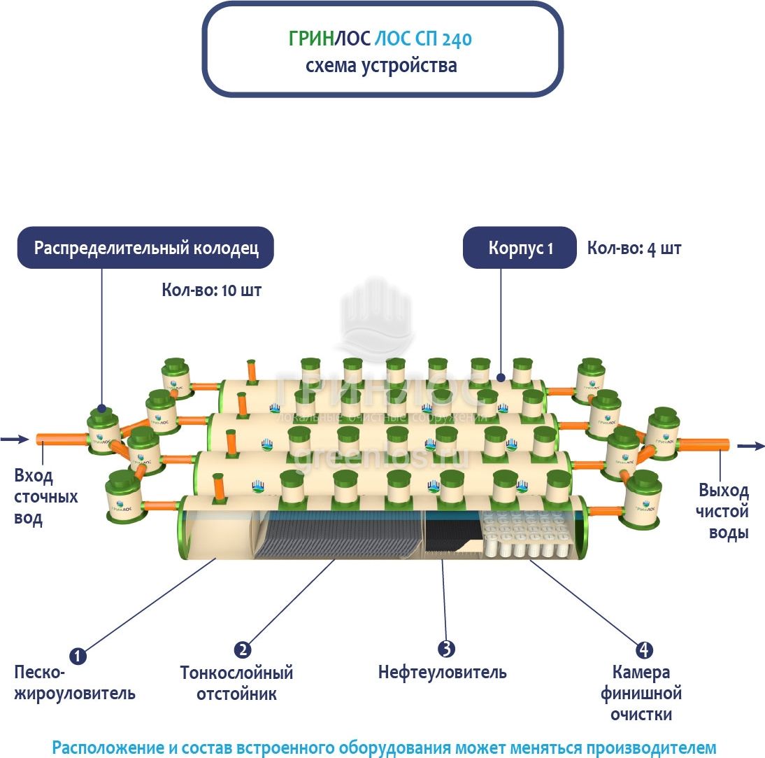 В Ливневой канализации ГРИНЛОС на 240м3 применяется классический принцип очистки дождевых и талых вод, заключающийся в поэтапном прохождении стоков через четыре отсека:
