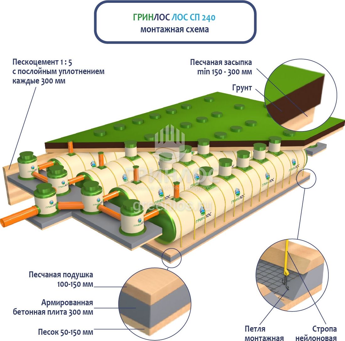 При заглублении ЛОС из стеклопластика на глубину не более 250 мм от верхнего пластикового горизонтального перекрытия до запланированного уровня земли, в однородных грунтах с низким уровнем вод обратную обсыпку допустимо производить песком, смешанным с цементом (марка не ниже М500). Соотношение цемента и песка для обсыпки составляет 1:5. Песчано-цементная засыпка производится послойно, с обязательным трамбованием и проливкой водой каждого слоя. Толщина каждого слоя 300 мм. При условии уровня грунтовых вод выше 1500 мм от уровня земли, при наличии плывуна, скальных грунтов и прочих нестандартных ситуациях, а также в случае заглубления ЛК 240-2300 Сп более чем на 250 мм песчано-цементную смесь необходимо заменить бетоном. Одновременно с засыпкой ливневой канализации, она заполняется водой. Уровень воды должен превышать уровень засыпки (бетонирования) не менее, чем на 200 мм и не более, чем на 500 мм.