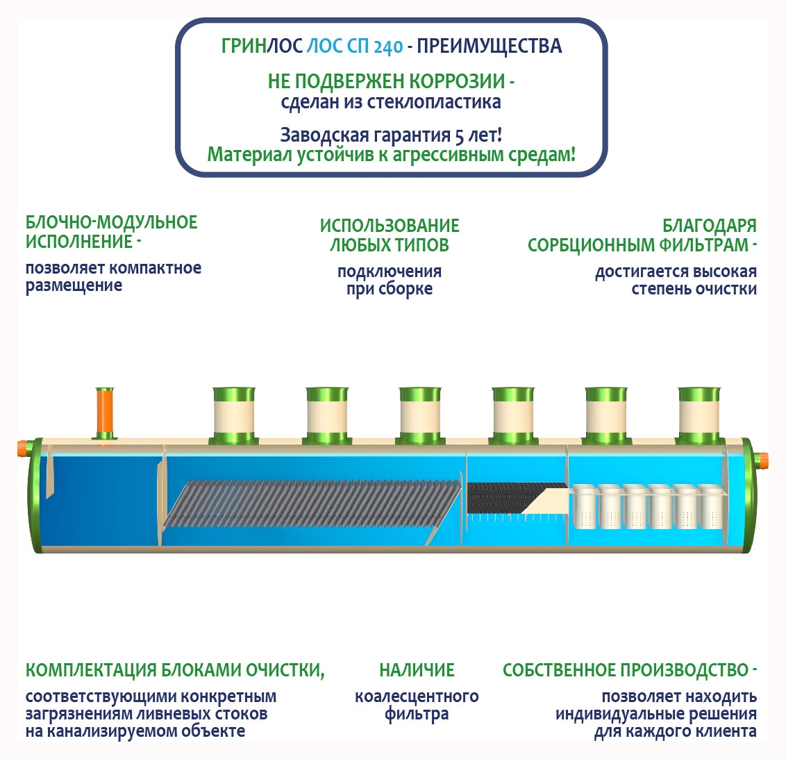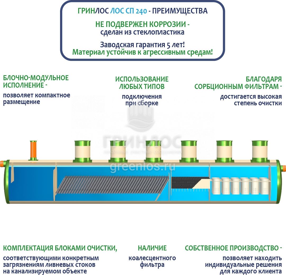 Гринлос ЛК 240-2300 Сп выполнена из стеклопластика – инертного материала, устойчивого к агрессивным средам.