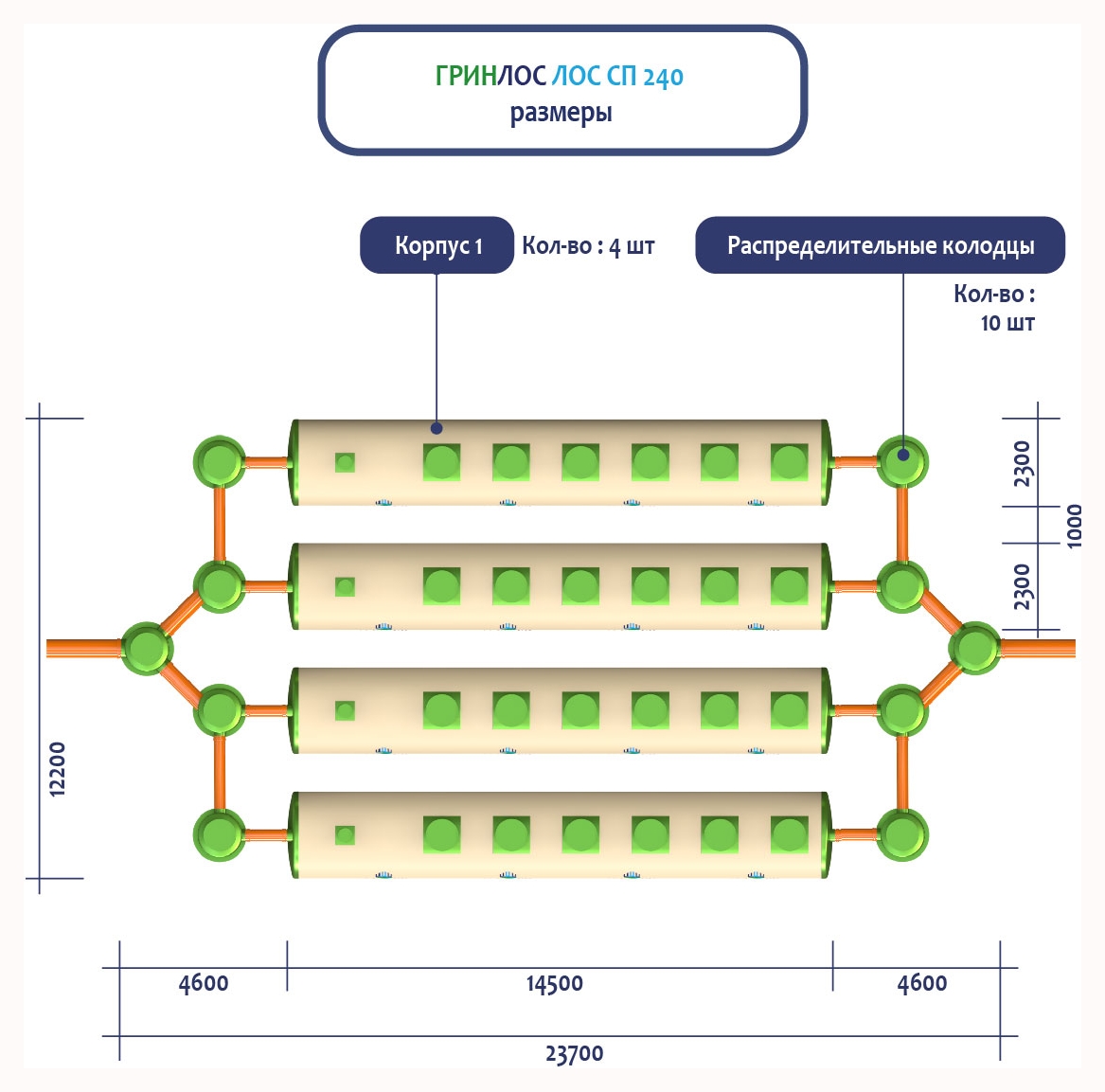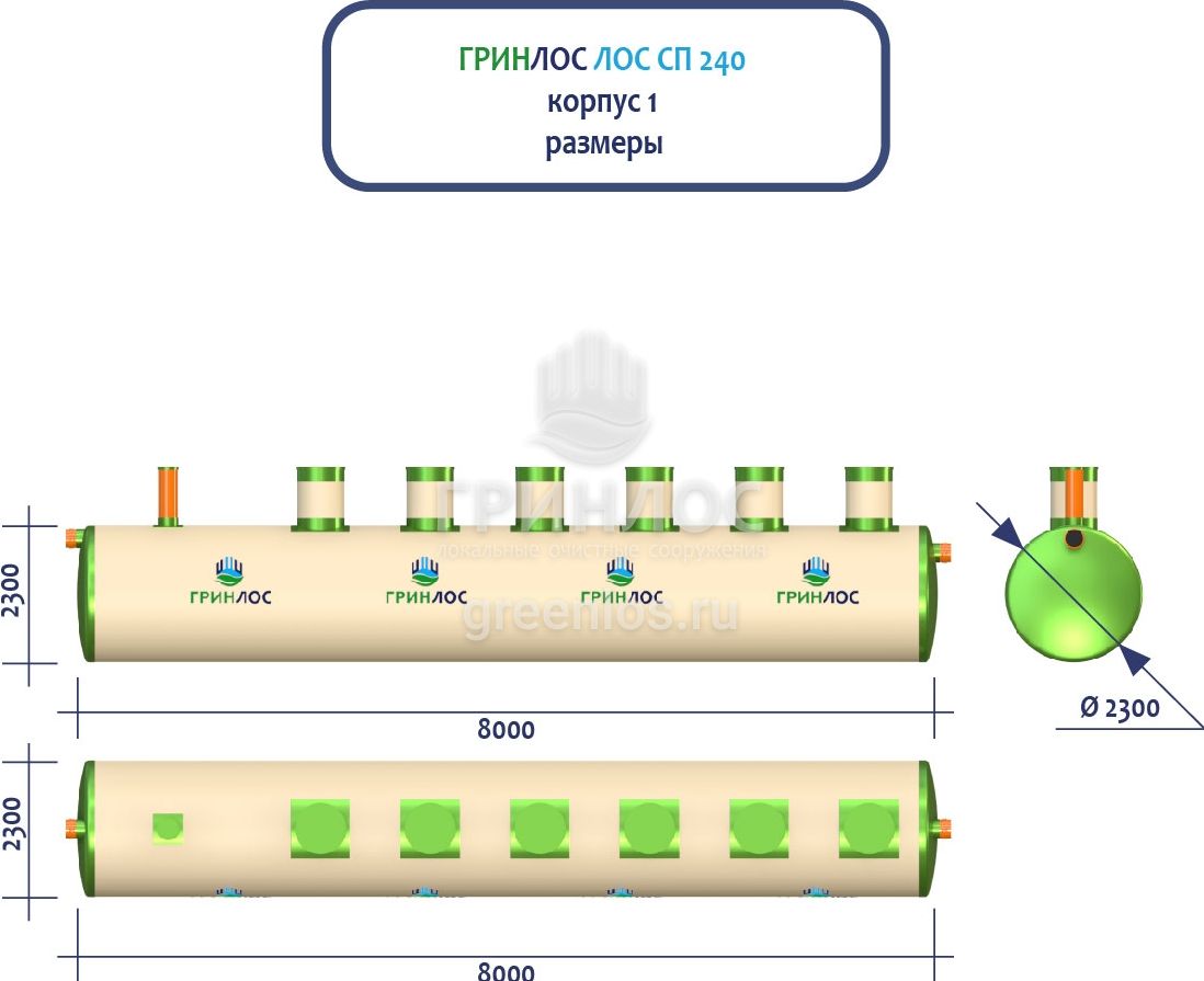 ГРИНЛОС Ливневая канализация 240-2300 стеклопластиковая представляет собой очистное сооружение ливневых стоков габаритами 14500*2300*2300 мм - 4 корпуса. Общий объем корпусов составляет 240.9 м3. Для установки станции потребуется применение вспомогательного оборудования.