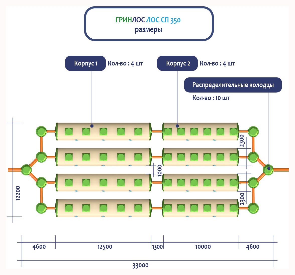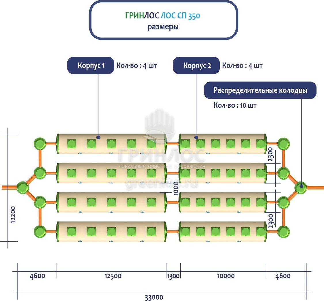 ГРИНЛОС Ливневая канализация 350-2300 стеклопластиковая представляет собой модульное очистное сооружение, состоящее из 8 корпусов размерами 12500*2300*2300 мм - 4 корпуса, 10000*2300*2300 мм - 4 корпуса. Объем отдельного корпуса 1 вида составляет 51.9 м3, 2 вида – 41.5 м3. Ввиду большого веса, для установки станции потребуется применение вспомогательного оборудования.