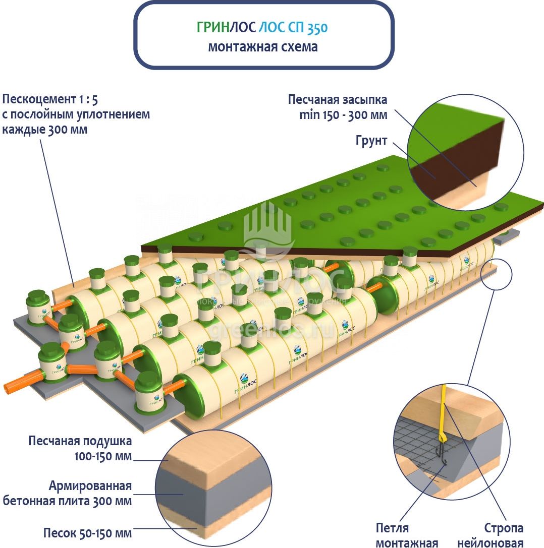 При заглублении ЛОС из стеклопластика на глубину не более 250 мм от верхнего пластикового горизонтального перекрытия до запланированного уровня земли, в однородных грунтах с низким уровнем вод обратную обсыпку допустимо производить песком, смешанным с цементом (марка не ниже М500). Соотношение цемента и песка для обсыпки составляет 1:5. Песчано-цементная засыпка производится послойно, с обязательным трамбованием и проливкой водой каждого слоя. Толщина каждого слоя 300 мм. При условии уровня грунтовых вод выше 1500 мм от уровня земли, при наличии плывуна, скальных грунтов и прочих нестандартных ситуациях, а также в случае заглубления ЛК 350-2300 Сп более чем на 250 мм песчано-цементную смесь необходимо заменить бетоном. Одновременно с засыпкой ливневой канализации, она заполняется водой. Уровень воды должен превышать уровень засыпки (бетонирования) не менее, чем на 200 мм и не более, чем на 500 мм.