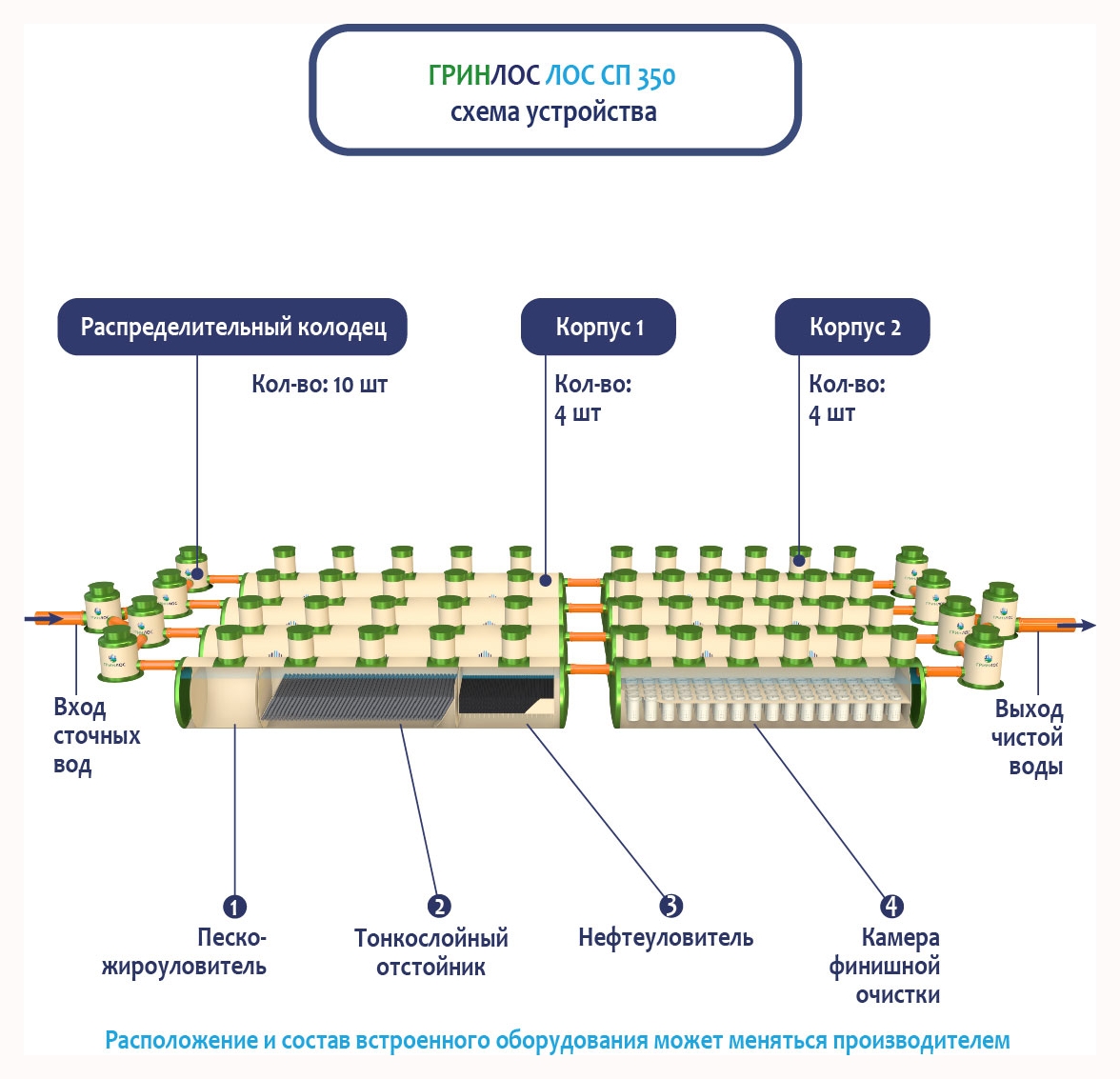 В Ливневой канализации ГРИНЛОС на 350м3 применяется классический принцип очистки дождевых и талых вод, заключающийся в поэтапном прохождении стоков через четыре отсека: