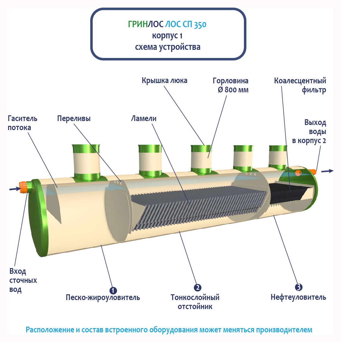 Стоки через входной патрубок корпуса Гринлос ГРИНЛОС Ливневая канализация 350-2300 стеклопластиковая попадают в песко-жироуловитель, где под воздействием седиментации из стоков выделяются взвеси и маслянистые вещества, за счет разницы плотностей твердые частицы оседают на дно, жиры собираются на поверхности.