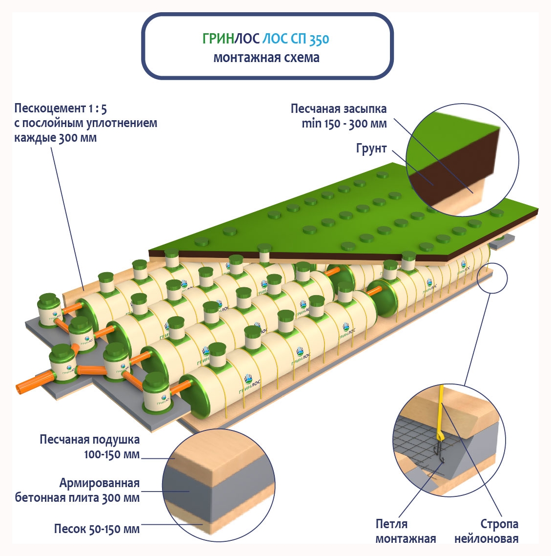 Перед началом работ выполняется входной контроль качества, осмотр оборудования с целью обнаружения дефектов, полученных при транспортировке и хранении, с последующим подписанием акта передачи оборудования в монтаж. Установка стеклопластиковой ливневой канализации ГРИНЛОС Ливневая канализация 350-2300 стеклопластиковая производится монтажным краном, с помощью четырехветвевой стропы. Изделие монтируется строго по уровню. После установки он фиксируется на плите синтетическими стропами за заранее подготовленные монтажные петли в плите.