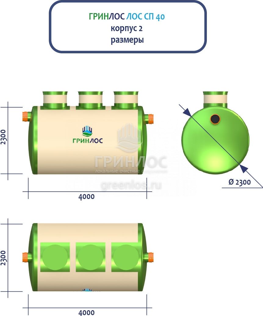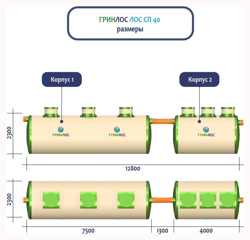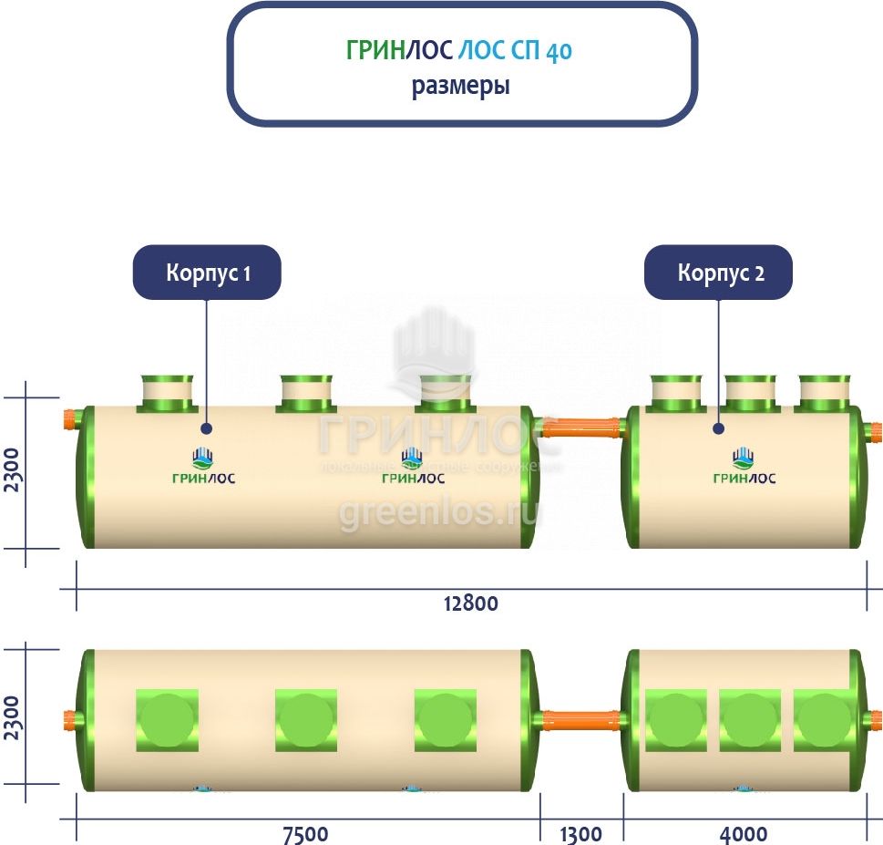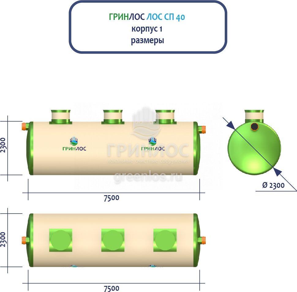 ГРИНЛОС Ливневая канализация 40-2300-2 стеклопластиковая представляет собой модульное очистное сооружение, состоящее из 2 корпусов размерами 7500*2300*2300 мм - 1 корпус, 4000*2300*2300 мм - 1 корпус. Объем отдельного корпуса 1 вида составляет 31.1 м3, 2 вида – 16.6 м3. Ввиду большого веса, для установки станции потребуется применение вспомогательного оборудования.