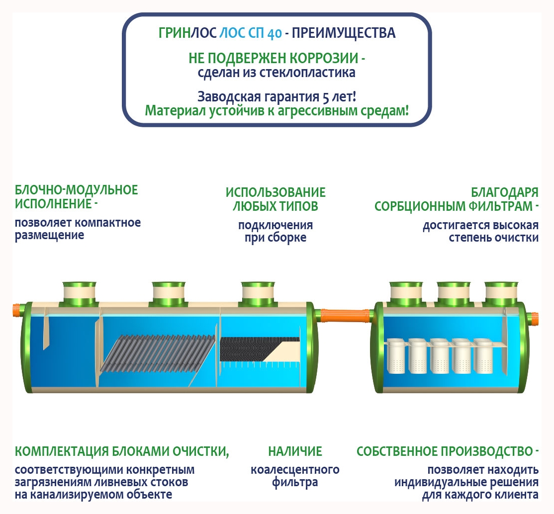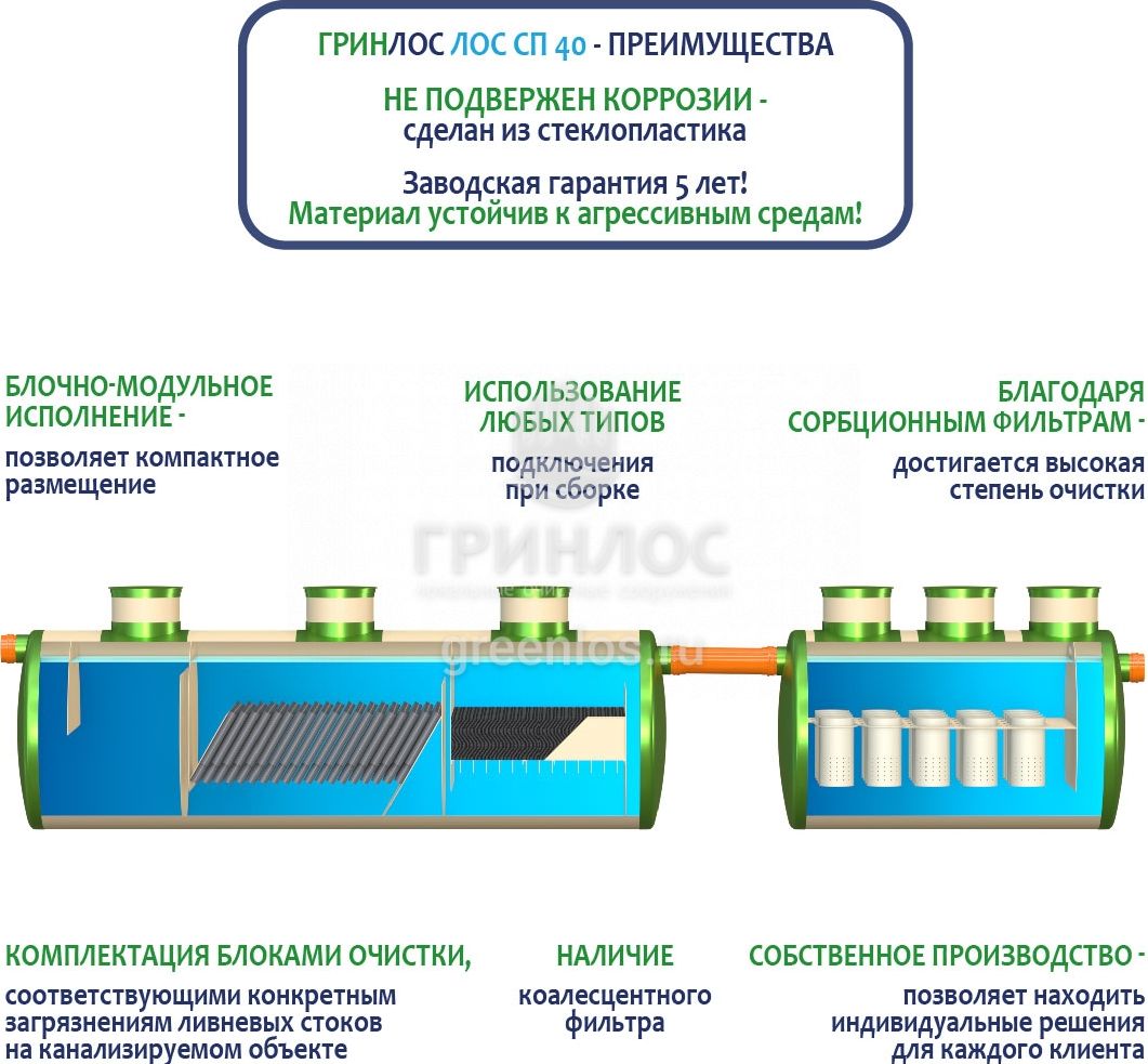 Ливневая канализация Гринлос ЛК 40-2300-2 Сп снабжена отсеком, в котором стоки проходят окончательную очистку через фильтр-патрон с сорбентом.