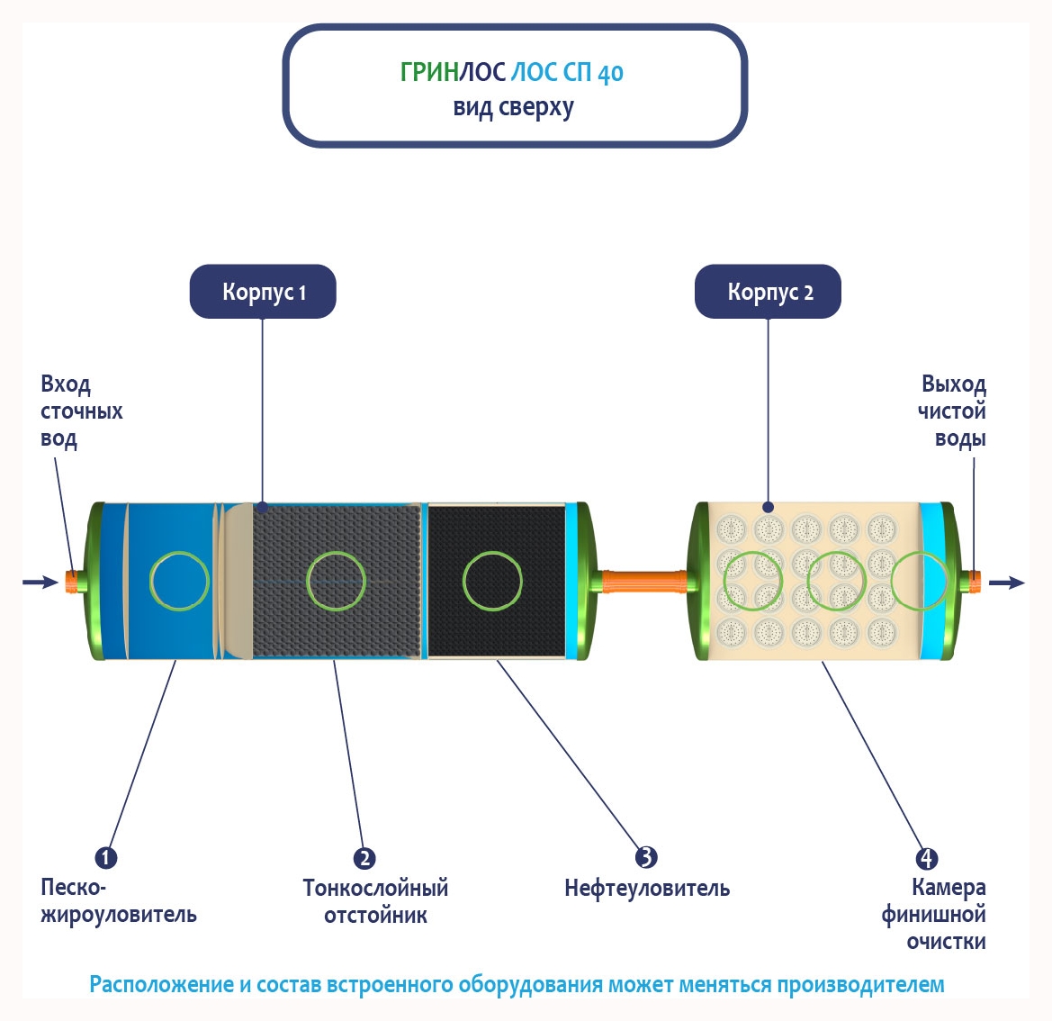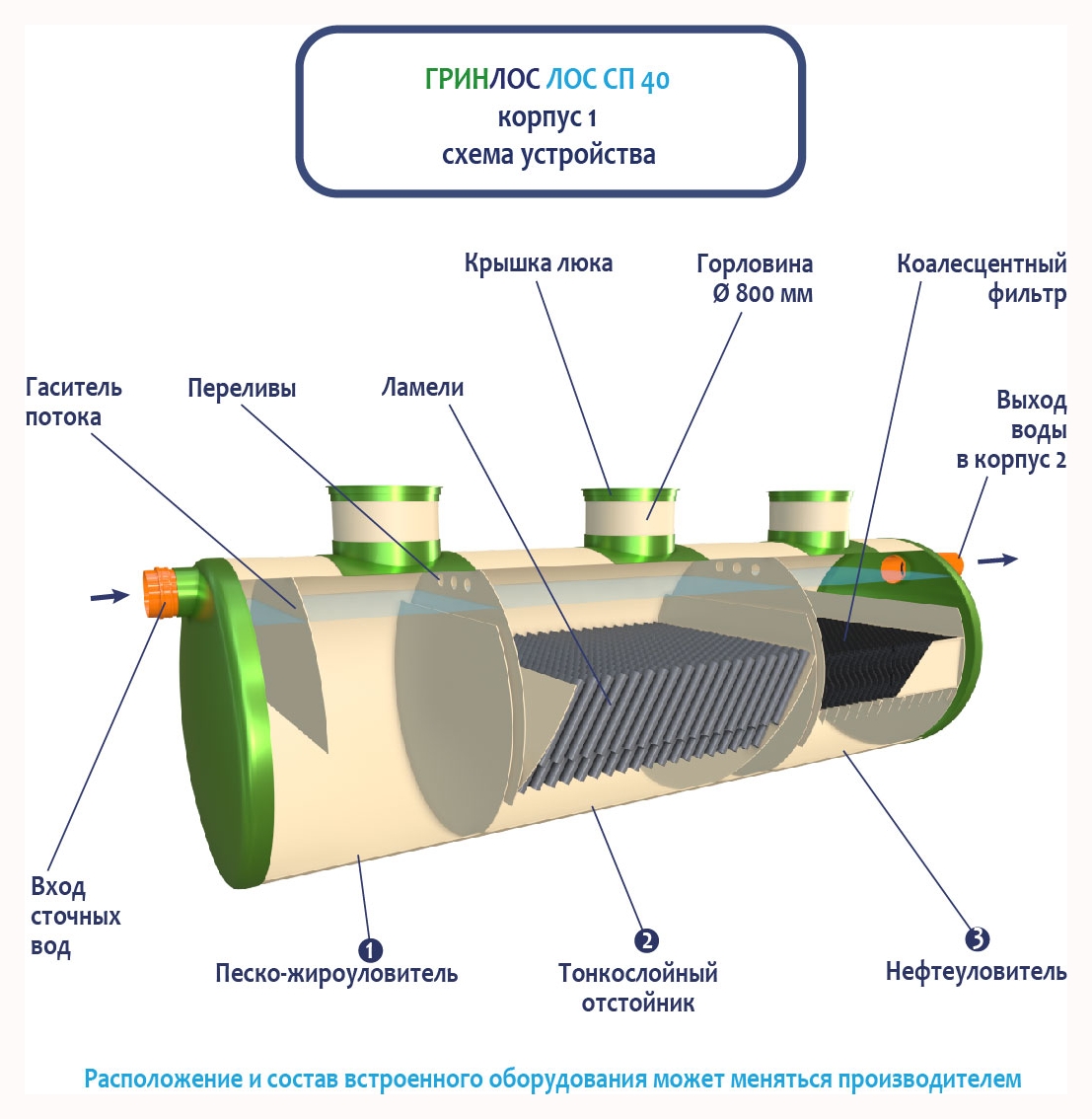Стоки через входной патрубок корпуса Гринлос ГРИНЛОС Ливневая канализация 40-2300-2 стеклопластиковая попадают в песко-жироуловитель, где под воздействием седиментации из стоков выделяются взвеси и маслянистые вещества, за счет разницы плотностей твердые частицы оседают на дно, жиры собираются на поверхности.